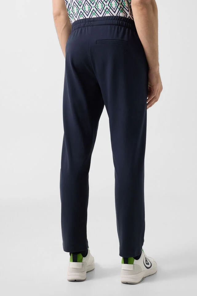 Trousers in a straight silhouette with slightly tapered legs, featuring double-stitched hems and an elastic waistband with drawstrings.