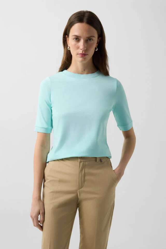 T-shirt in straight silhouette, round collar in elastic fabric, short sleeves with elastic ribbed cuffs