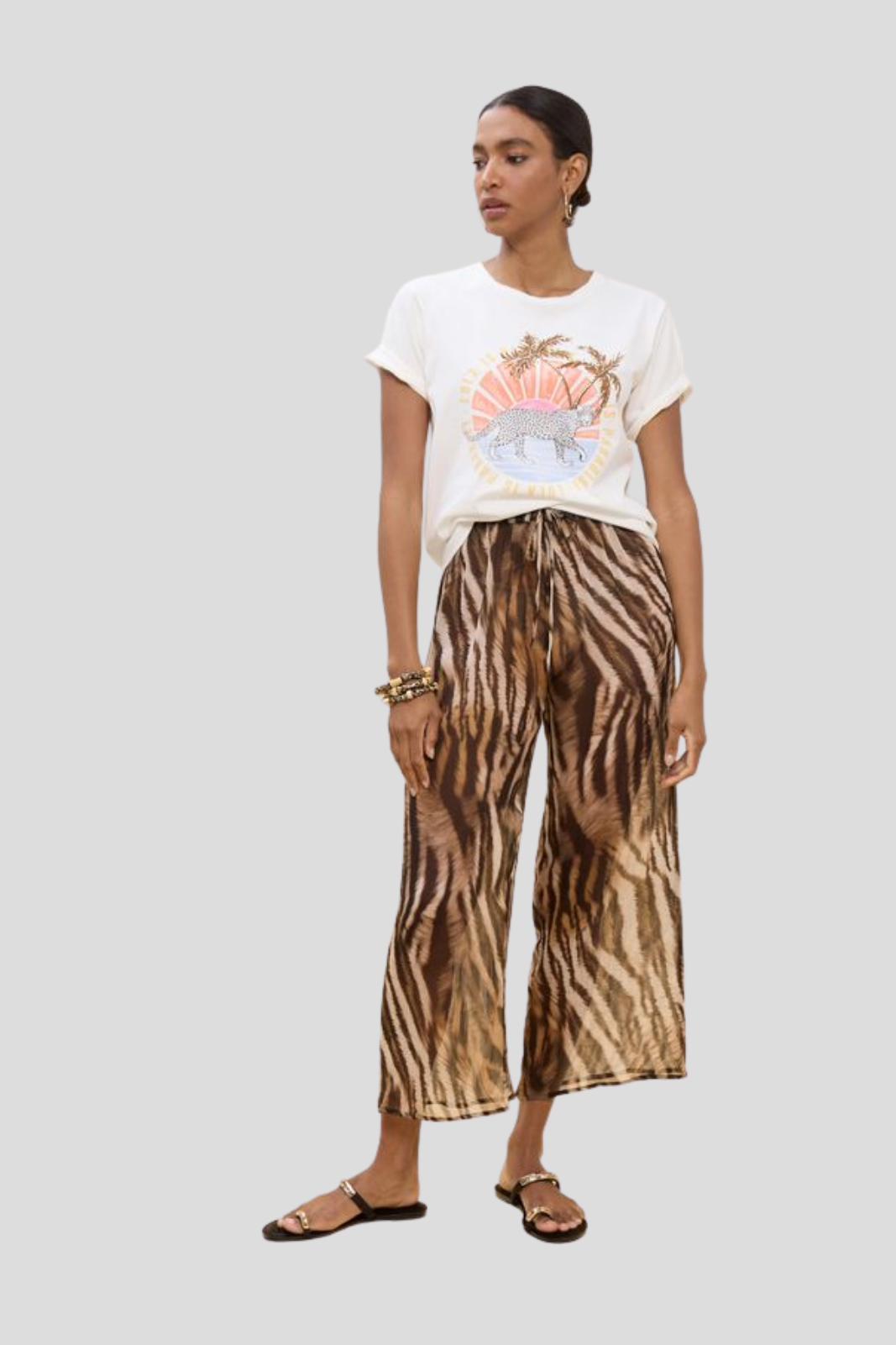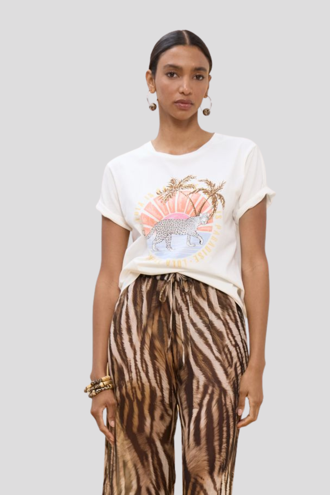 Тениска в класически силует, декорирана с изразителен животински принт и деликатни мотиви на палмови дървета — съвършено съчетание на непреходна форма и екзотична индивидуалност