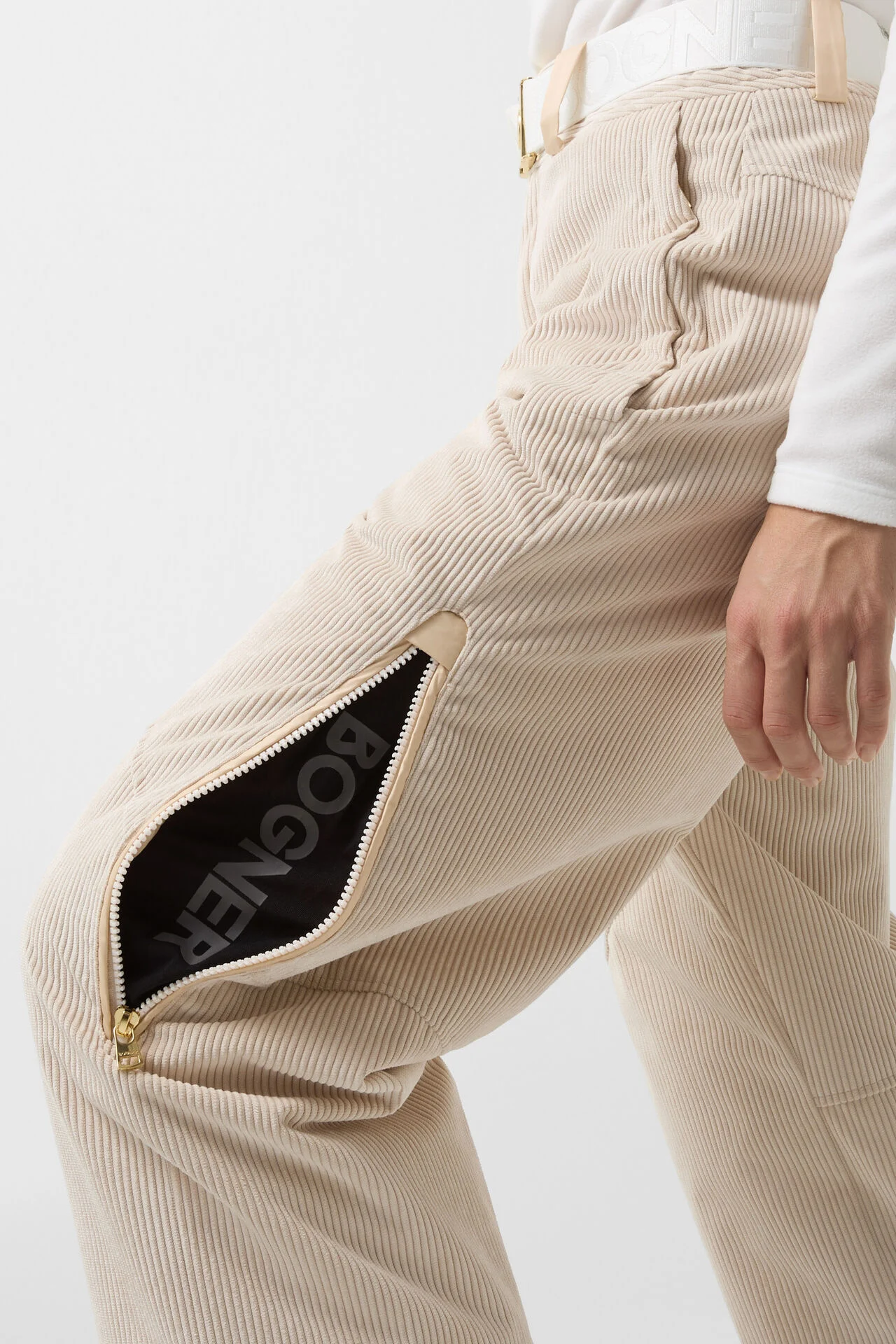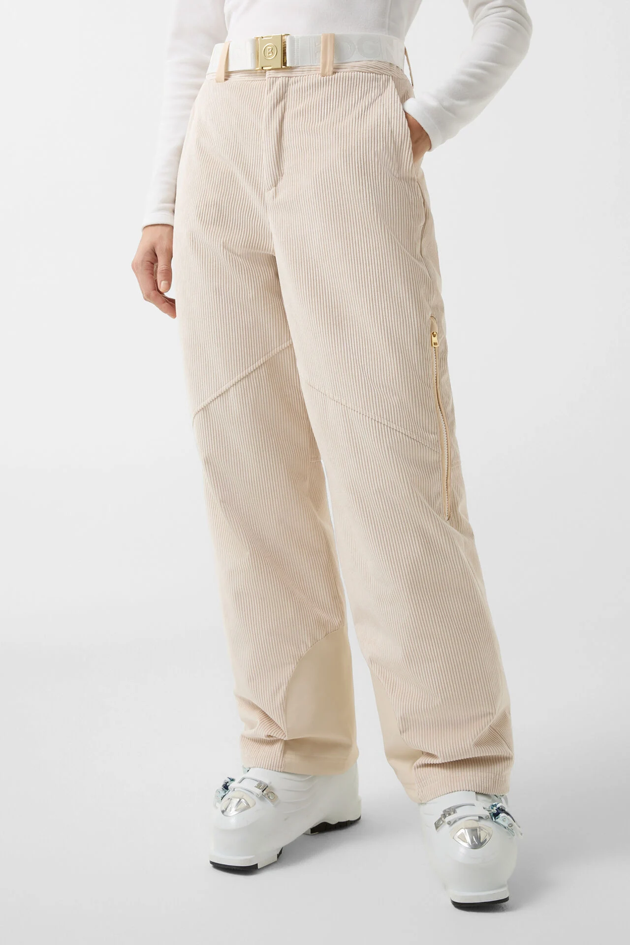 Velvet ski trousers in a straight silhouette and mid-waist, distinguished by their wide legs and fine balance between comfort and functionality