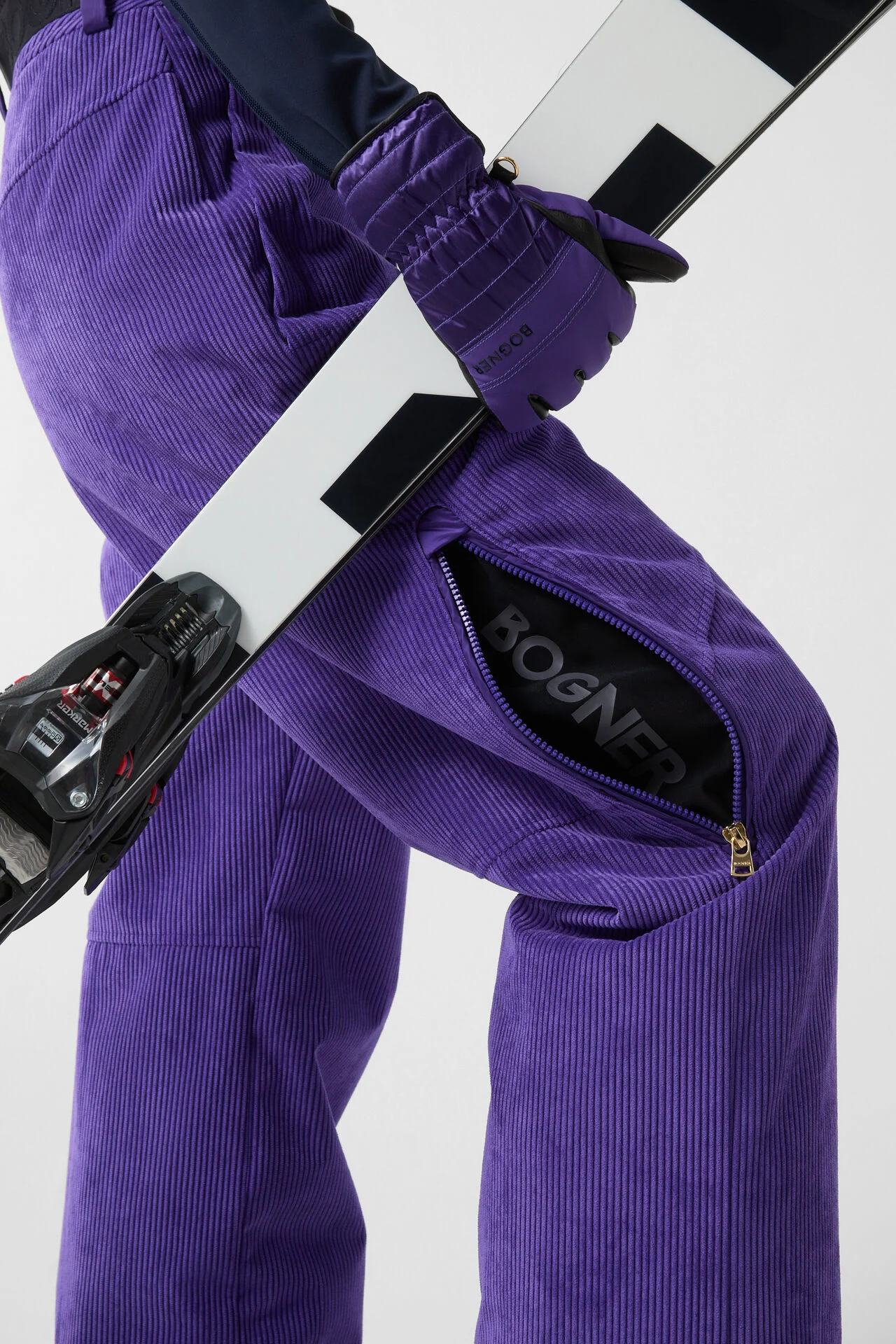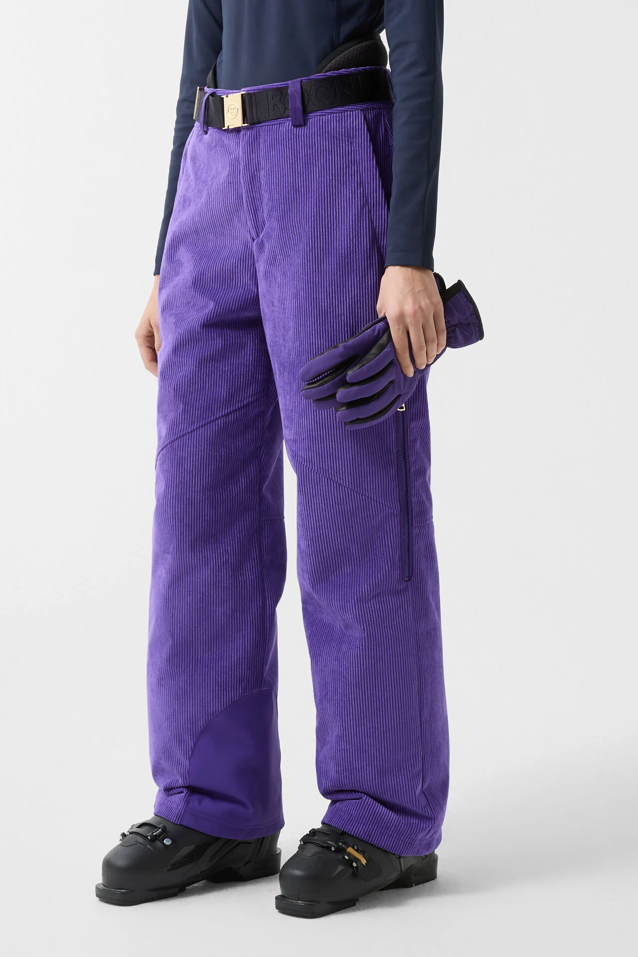 Velvet ski trousers in a straight silhouette and mid-waist, distinguished by their wide legs and fine balance between comfort and functionality