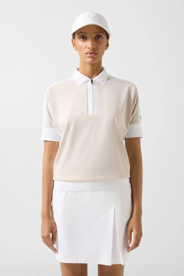 Ribbed polo collar and short sleeves with rib-knit cuffs add elegant structure, while the short B-neck and dropped shoulders add modern casualness
