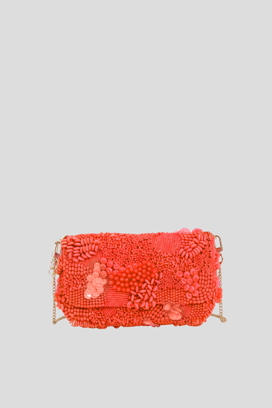 Baguette bag made of fabric with delicate tone-on-tone pink beads