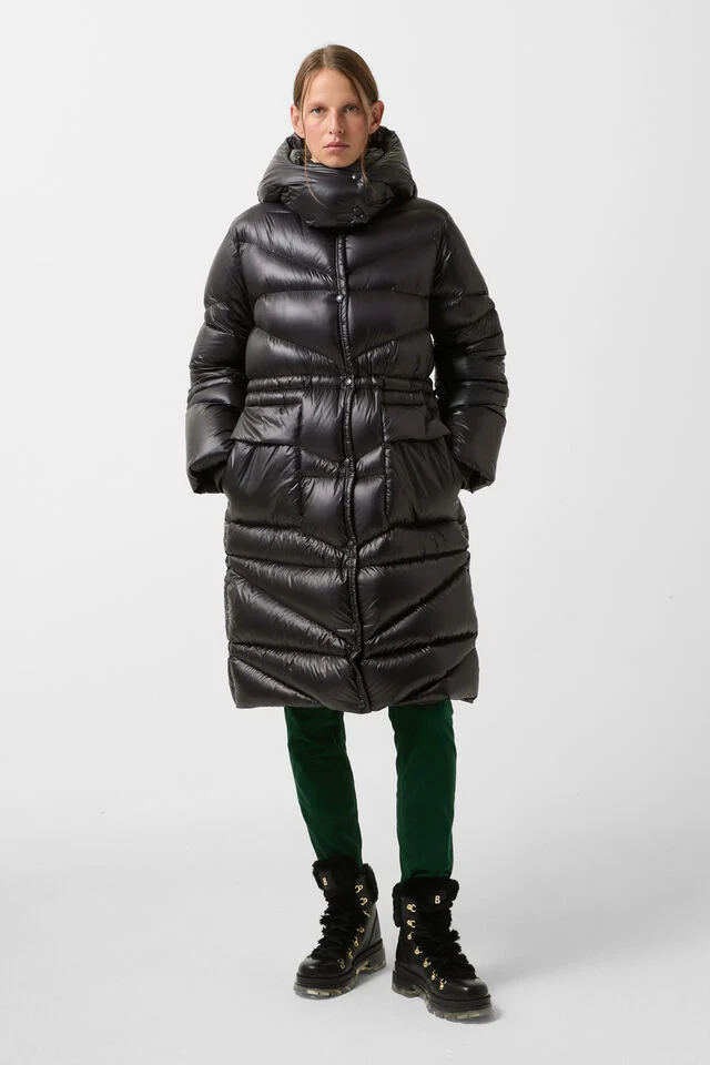 Down jacket in a classic silhouette and padded collar with a straight waist, equipped with a removable hood with drawstrings for optimal protection
