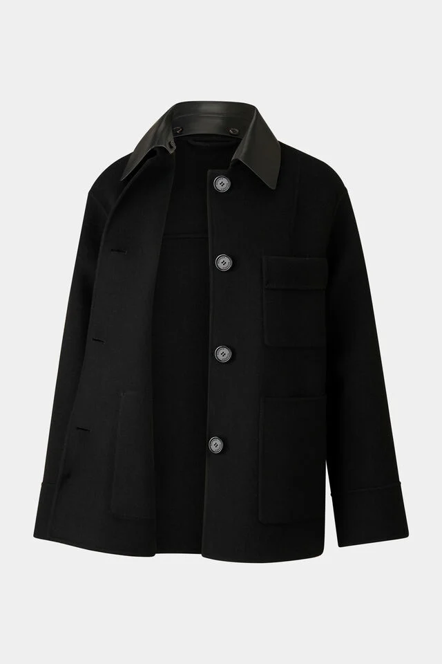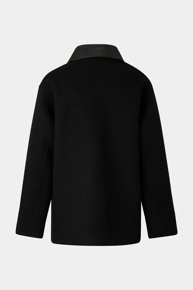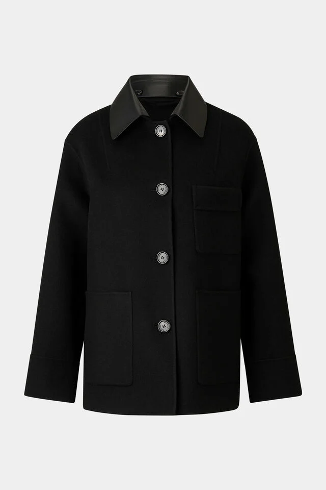 Jacket in straight silhouette, detachable leather collar and high collar.