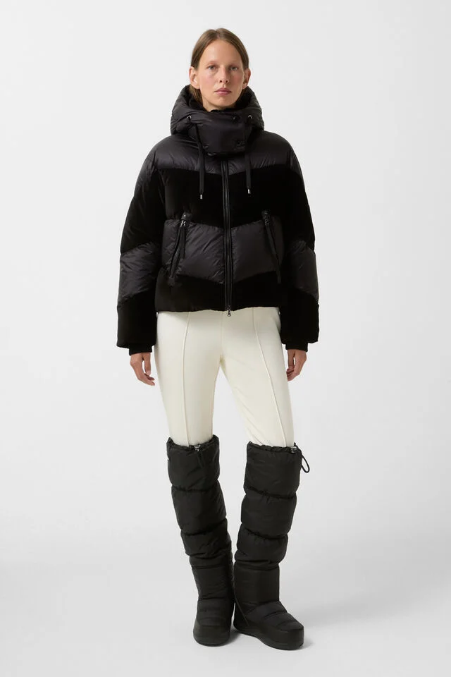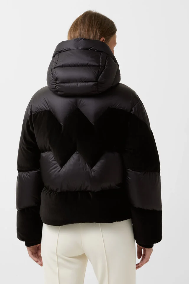 A quilted down jacket with a slightly classic silhouette, enriched with velvet sections for a sophisticated look