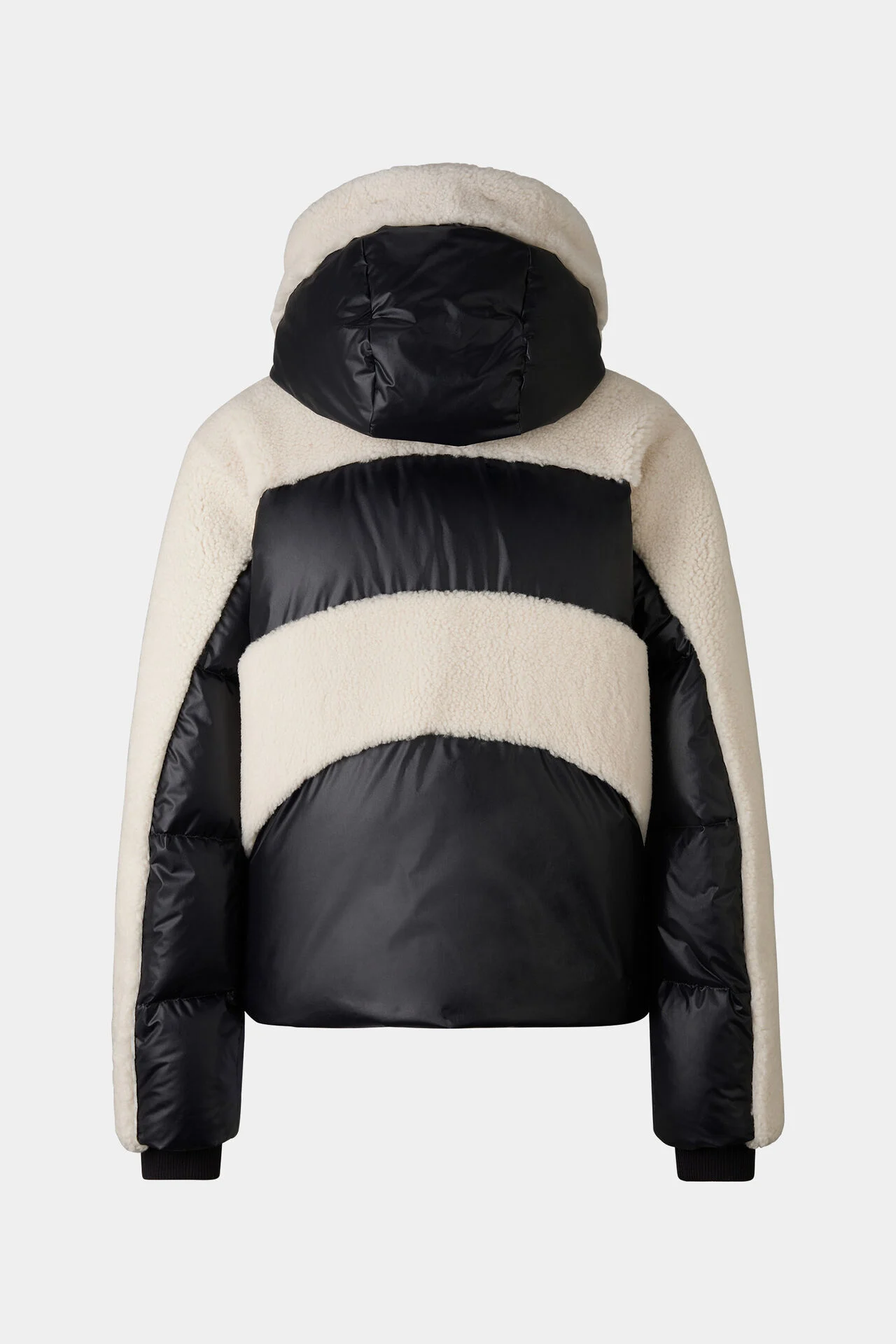 Quilted down ski jacket with lambskin leather sections fixed hood with drawcords and embossed B-stoppers long sleeves cuffs on sleeves with ribbed inset lining two-way zip with B-shaped snap closure lined with BOGNER pouch ski card pocket with zipper on sleeve two side pockets with zipper inside pocket inside ribbon with logo and brown color floating lining with letter design durable water-repellent coating water column 10,000 mm breathability 10,000 g per m² per 24 hours goose down and feather warming lining elastic snow protector with teak flapsnap fastening on the inside hem finish with drawstrings and stopper back length 60 cm