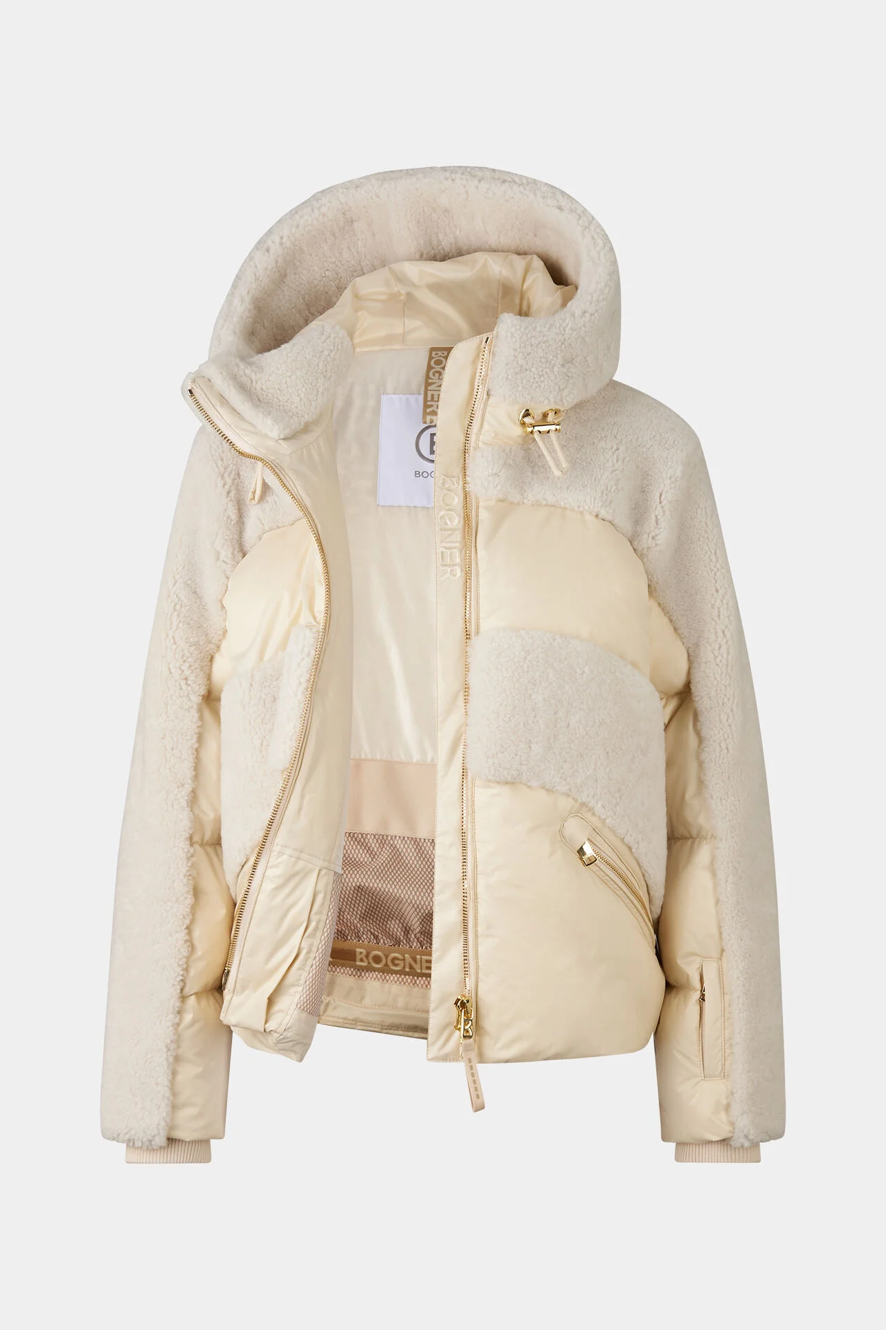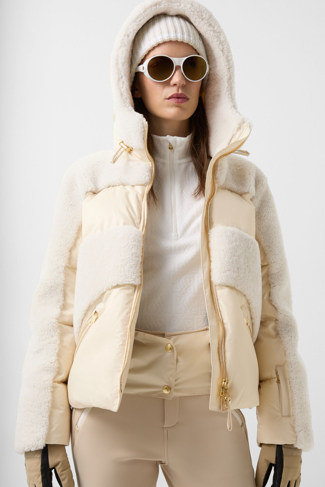 Quilted down ski jacket with lambskin leather sections fixed hood with drawcords and embossed B-stoppers long sleeves cuffs on sleeves with ribbed inset lining two-way zip with B-shaped snap closure lined with BOGNER pouch ski card pocket with zipper on sleeve two side pockets with zipper inside pocket inside ribbon with logo and brown color floating lining with letter design durable water-repellent coating water column 10,000 mm breathability 10,000 g per m² per 24 hours goose down and feather warming lining elastic snow protector with teak flapsnap fastening on the inside hem finish with drawstrings and stopper back length 60 cm