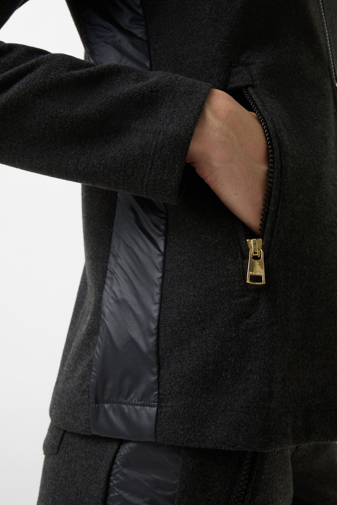Second layer in a straight silhouette and fixed nylon hood fitted with drawcords, stopper and lightweight lining that provides comfort and functionality