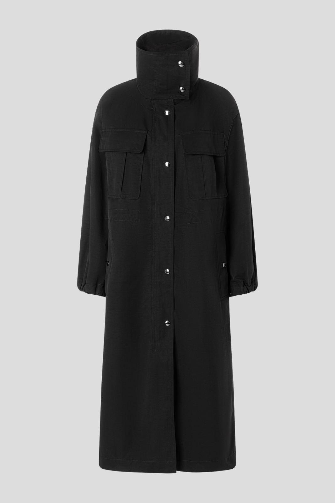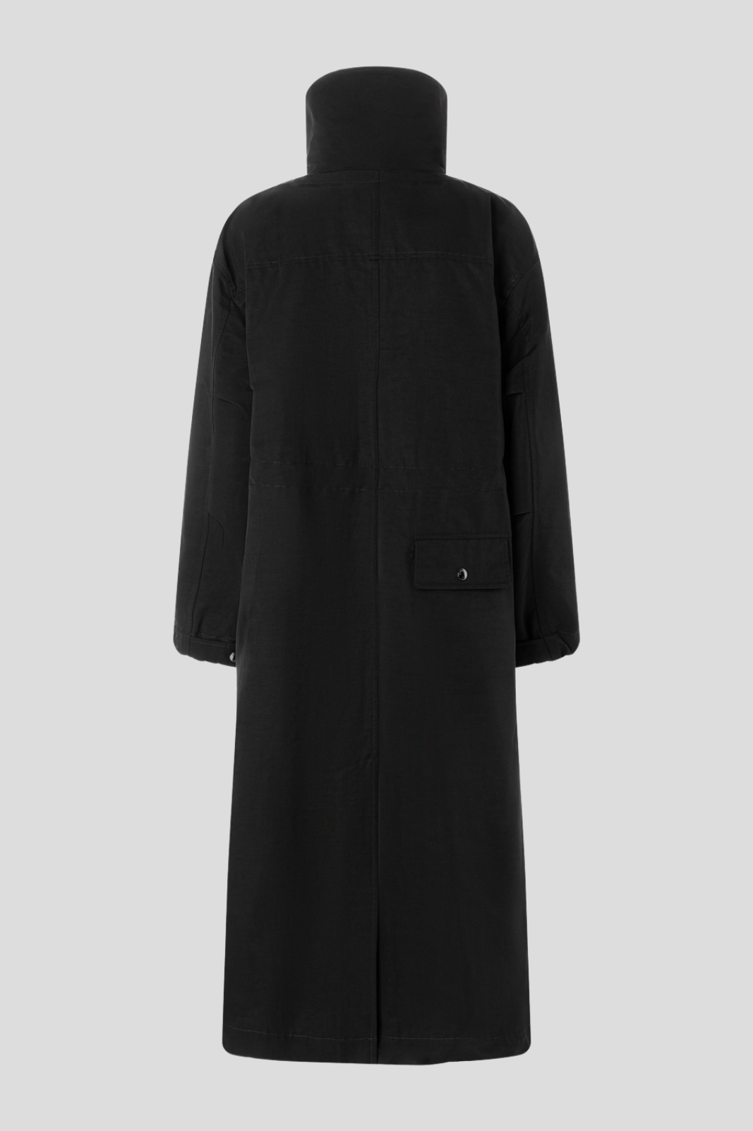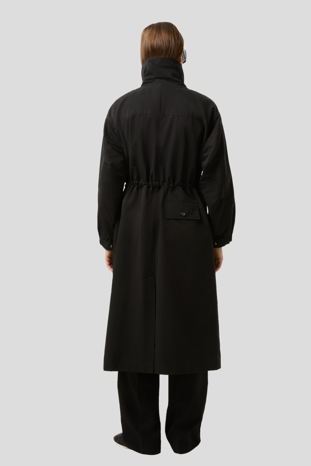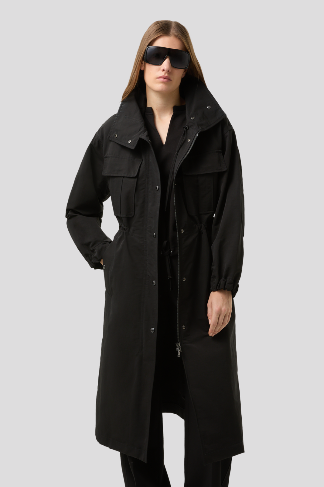 Model impresses with a high collar and wide neckline, finely balanced with an adjustable waist for a precise, tailored fit