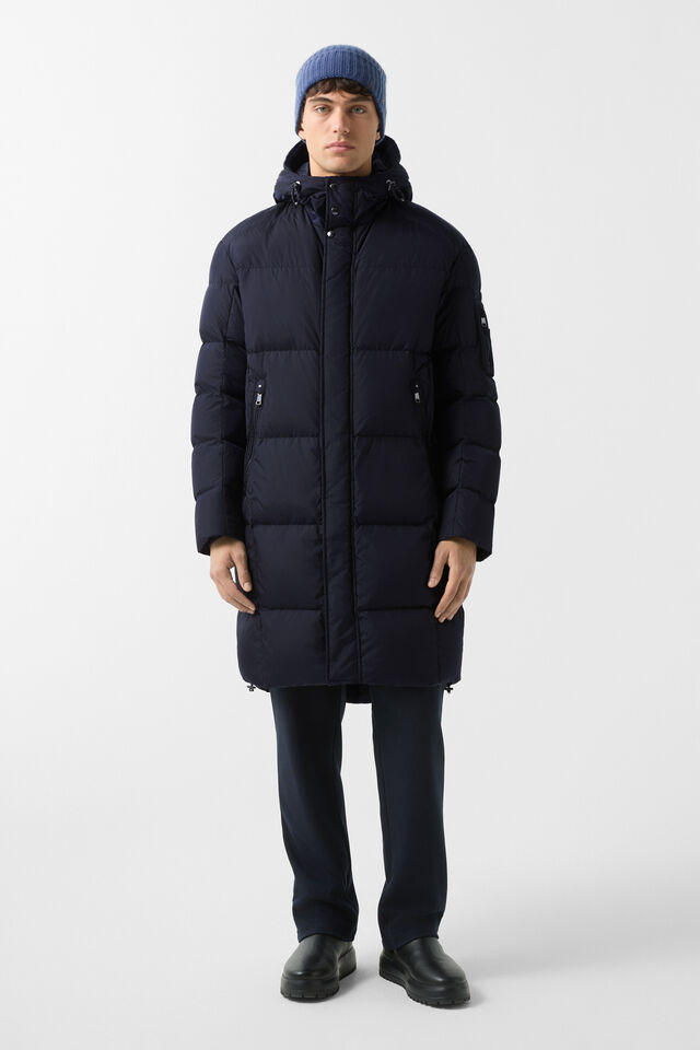 The padded stand-up collar ensures a refined and stable silhouette, complemented by a removable hood with adjustable ties and a concealed stopper at the back