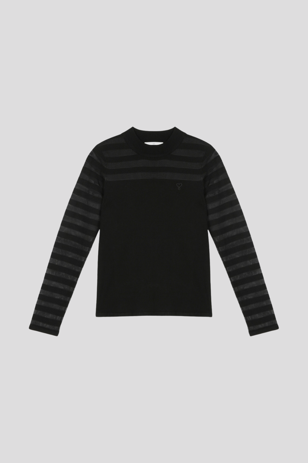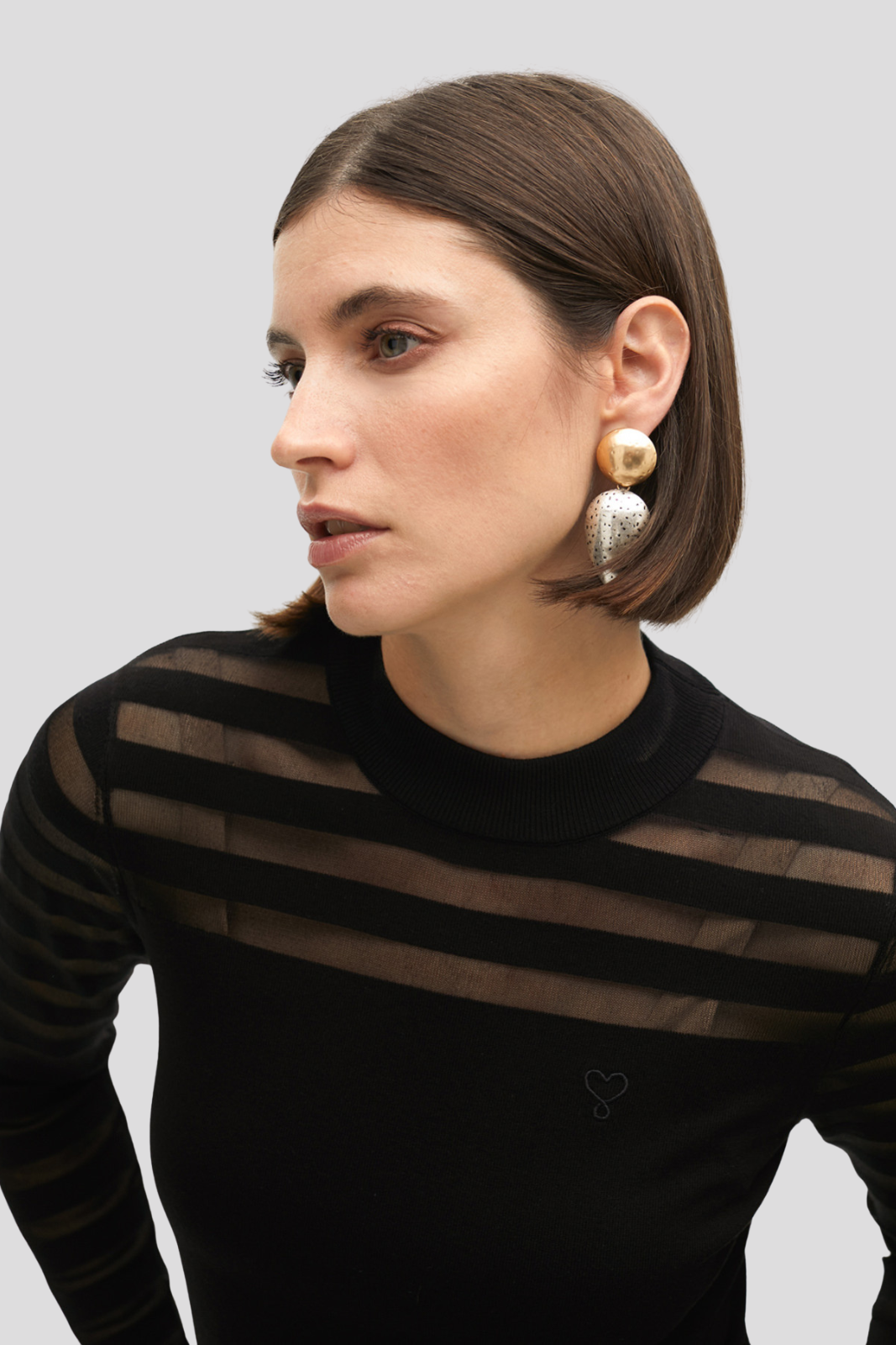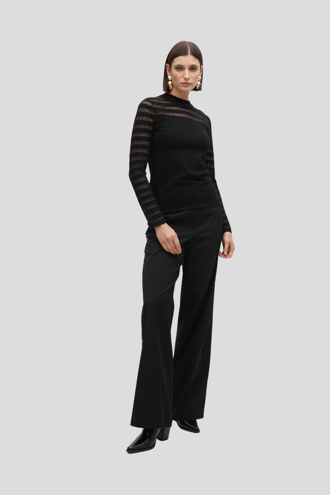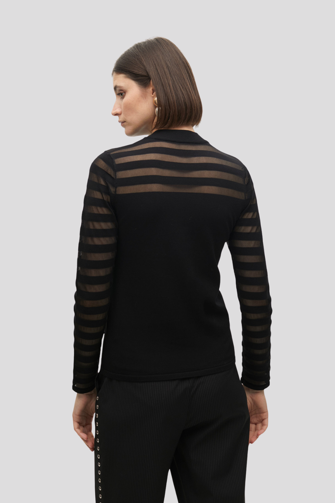 Елегантен фин плетен пуловер с прозрачни райета в областта на гърдите и ръкавите