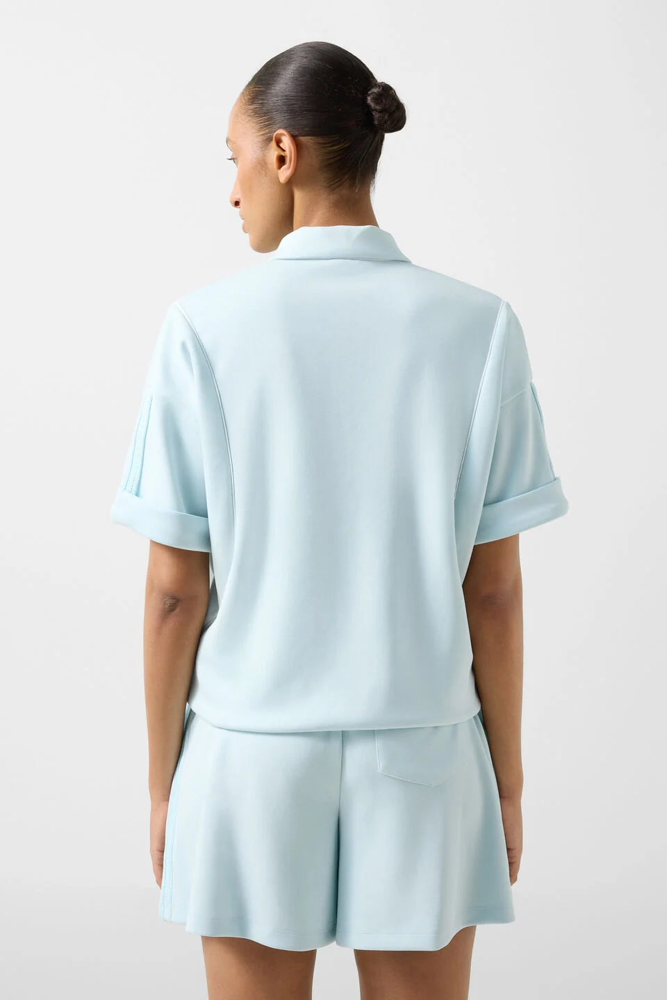The dropped shoulders and short sleeves create a current silhouette, while the shaping seams emphasize the body line in a subtle and unobtrusive way