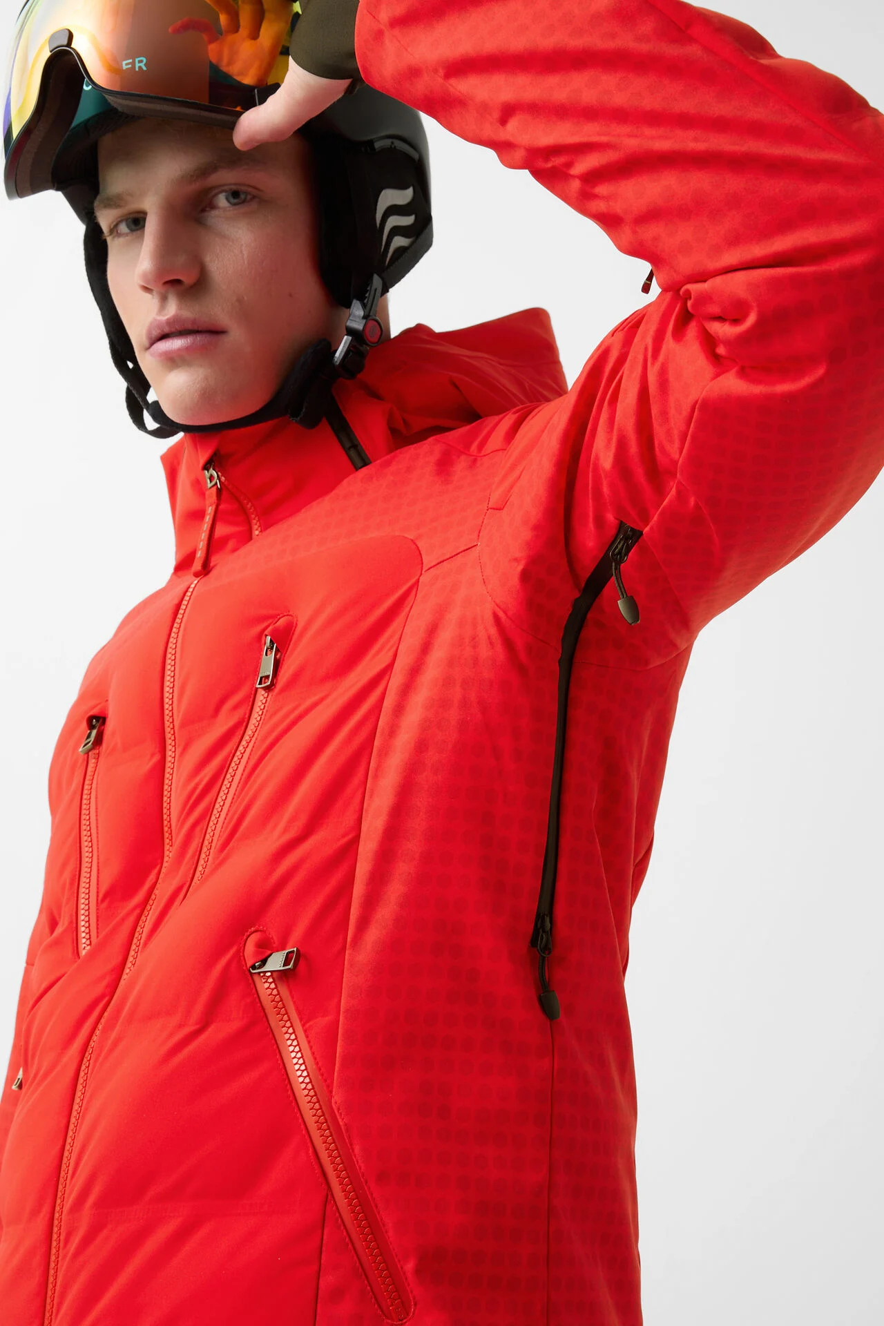 An elasticated snowguard with teak-tack fastening inside and integrated Cohaesive System, a patented multi-component technical hem adjustment technology created by laser cutting and thermal lamination, provide exceptional functionality and finesse in the detail