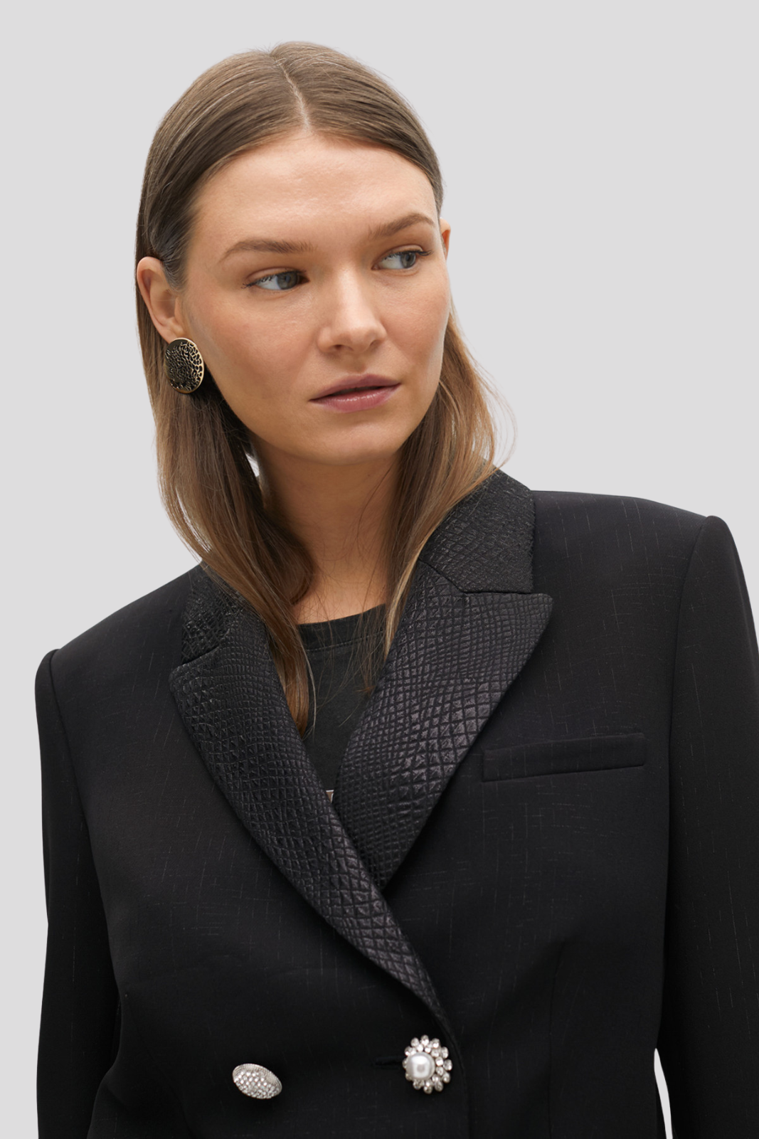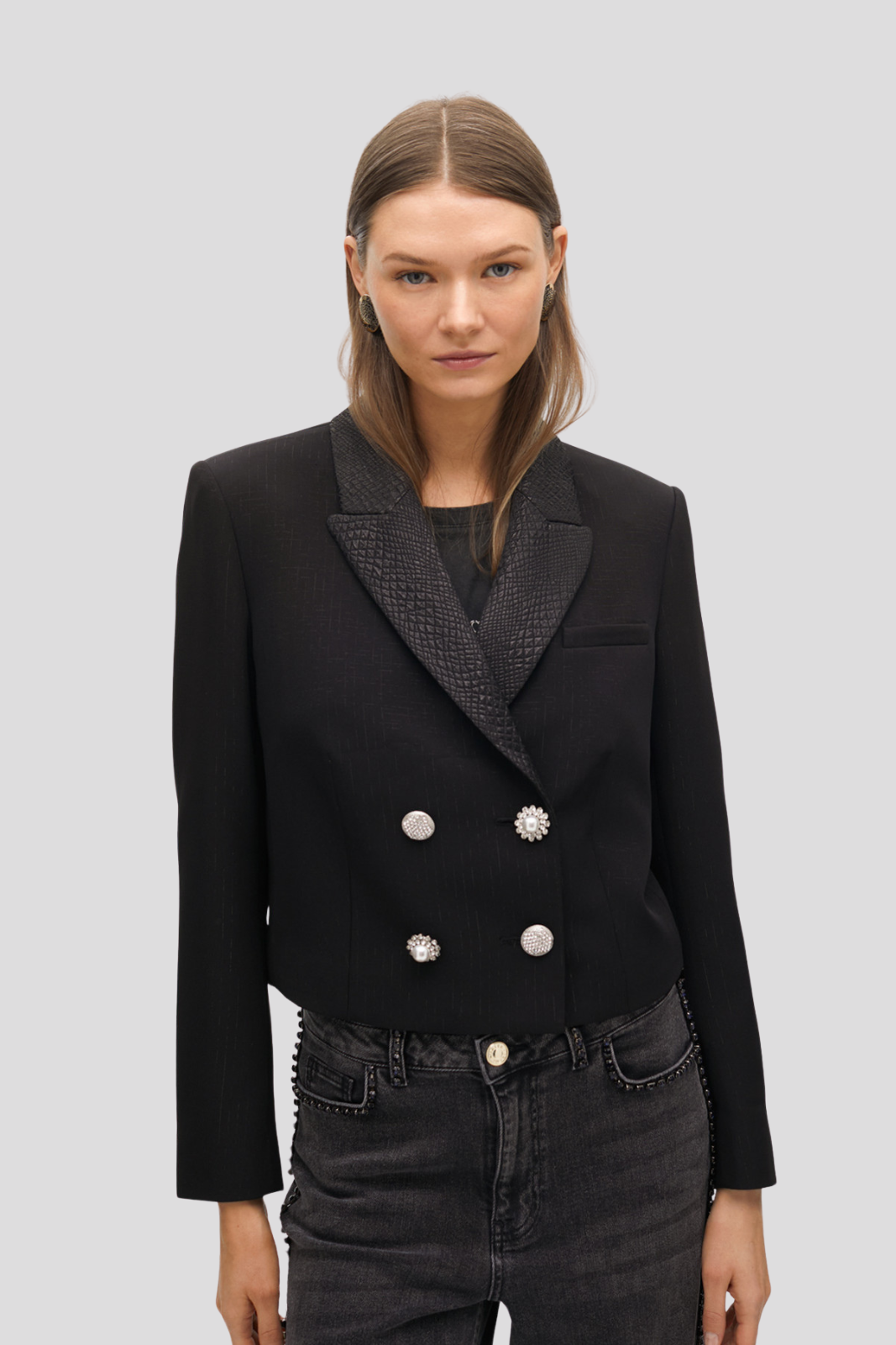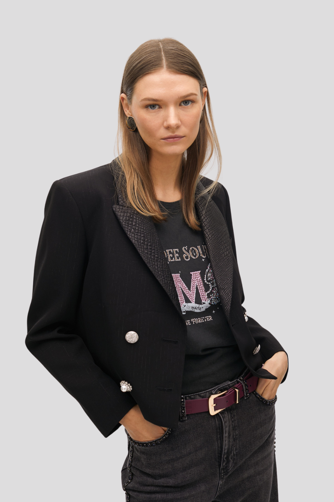 Елегантно късо сако с ревери в животински принт и бижутени копчета