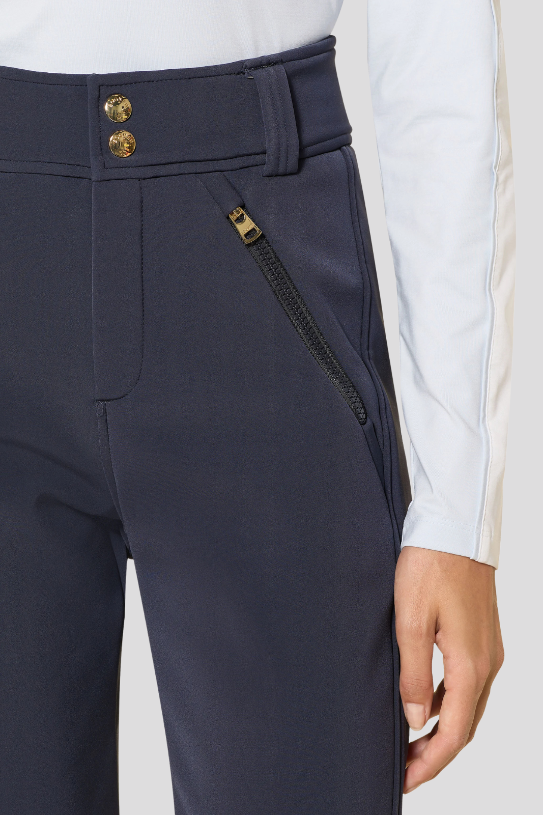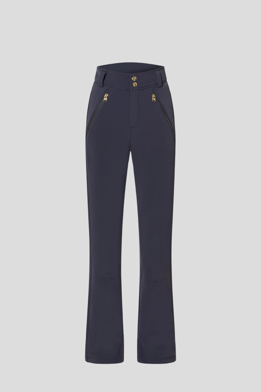 Slim Fit ski pants with a mid-rise waist and straight leg highlighted by seams that give a perfect fit hems with B-button protection adjustable back zippers and internally fixed snow cuffs fastening with logo button teaktack and concealed zipper for a sleek and functional finish Belt with kidney protection and integrated nuts for added stability Two zippered pockets for secure storage of personal items Logo accents and embossed hardware that add sophisticated style Water-repellent coating 200 mm water column and high breathability 7000 g/m²/24 hrs providing comfort in active winter conditions