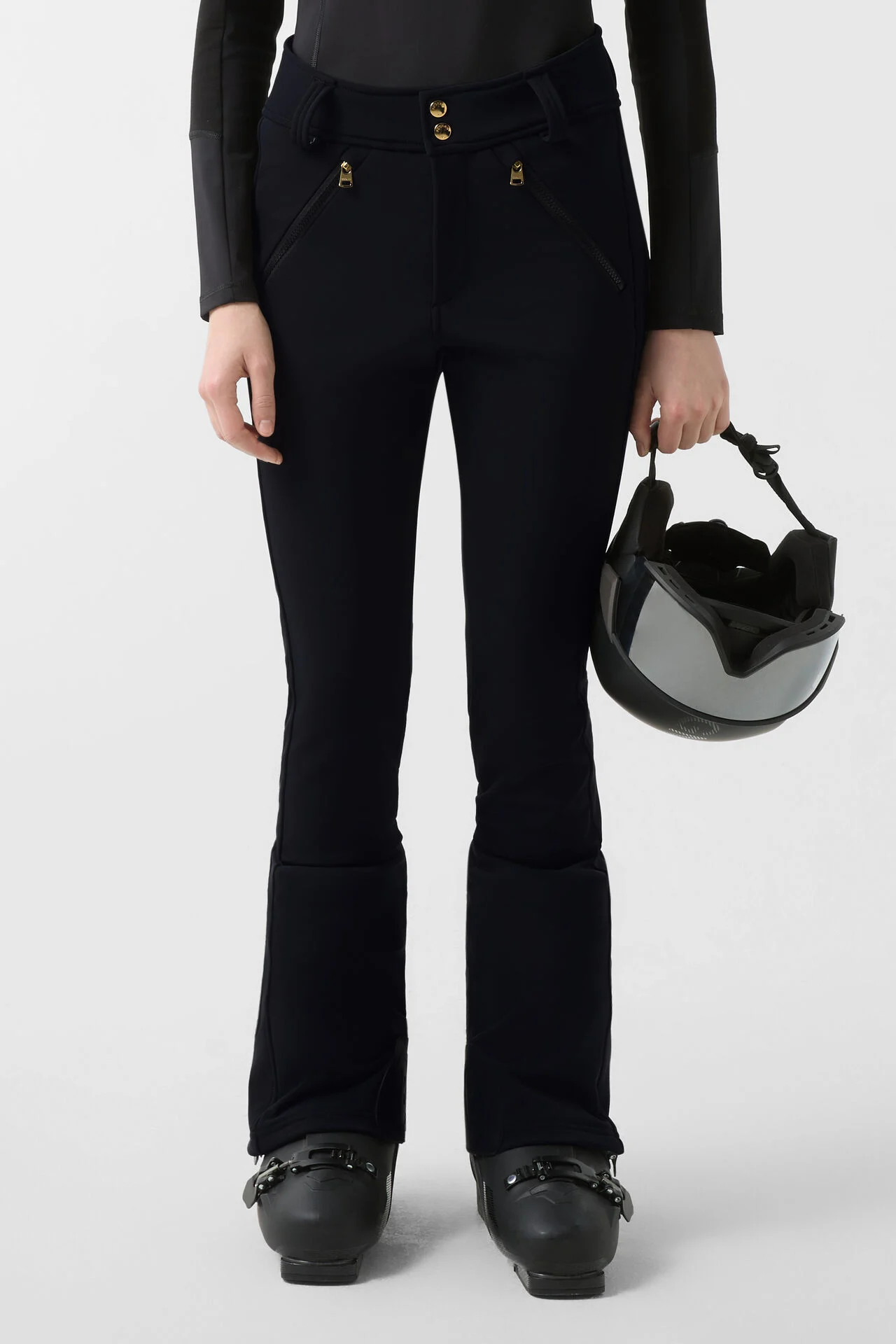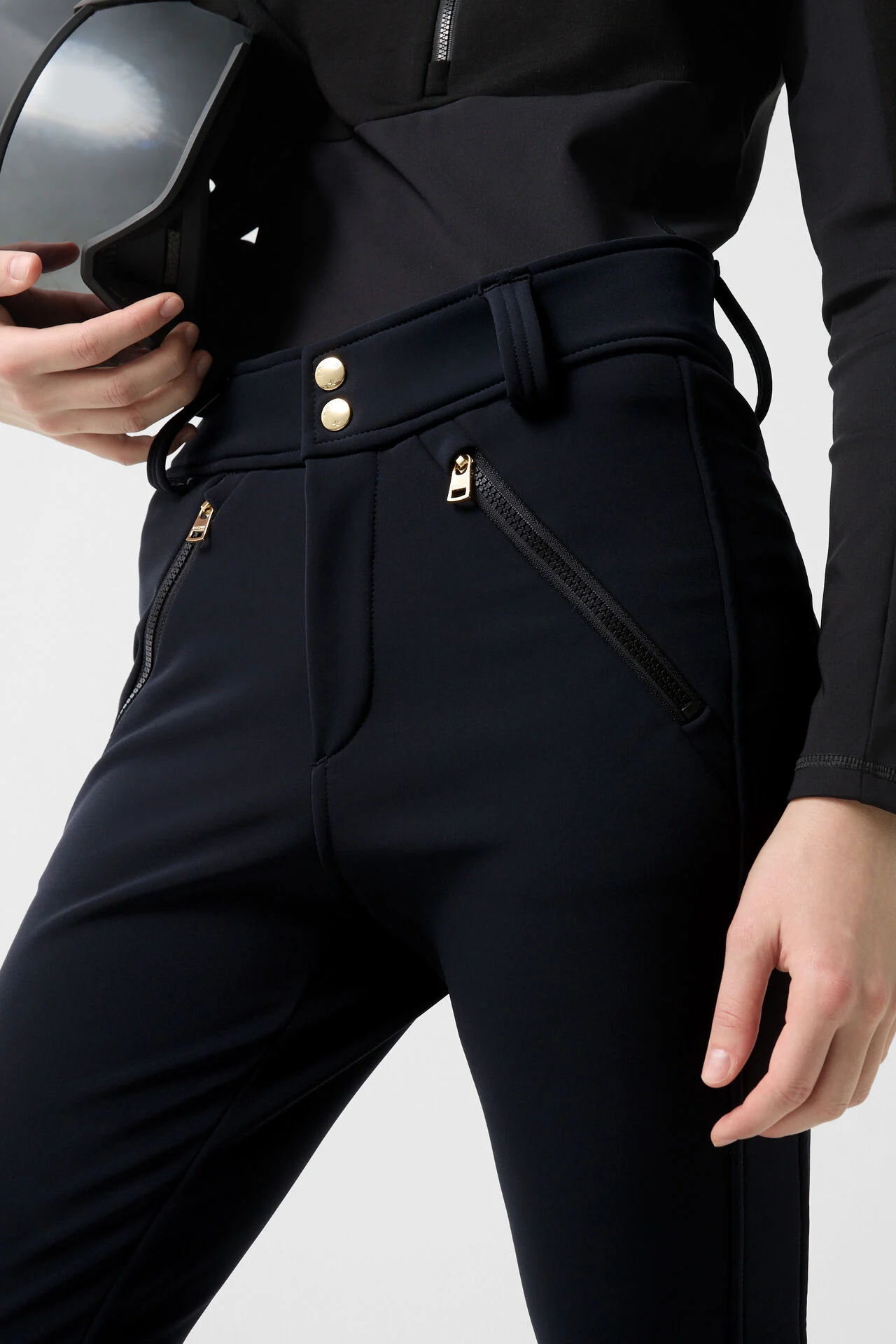Slim Fit ski pants with a mid-rise waist and straight leg highlighted by seams that give a perfect fit hems with B-button protection adjustable back zippers and internally fixed snow cuffs fastening with logo button teaktack and concealed zipper for a sleek and functional finish Belt with kidney protection and integrated nuts for added stability Two zippered pockets for secure storage of personal items Logo accents and embossed hardware that add sophisticated style Water-repellent coating 200 mm water column and high breathability 7000 g/m²/24 hrs providing comfort in active winter conditions