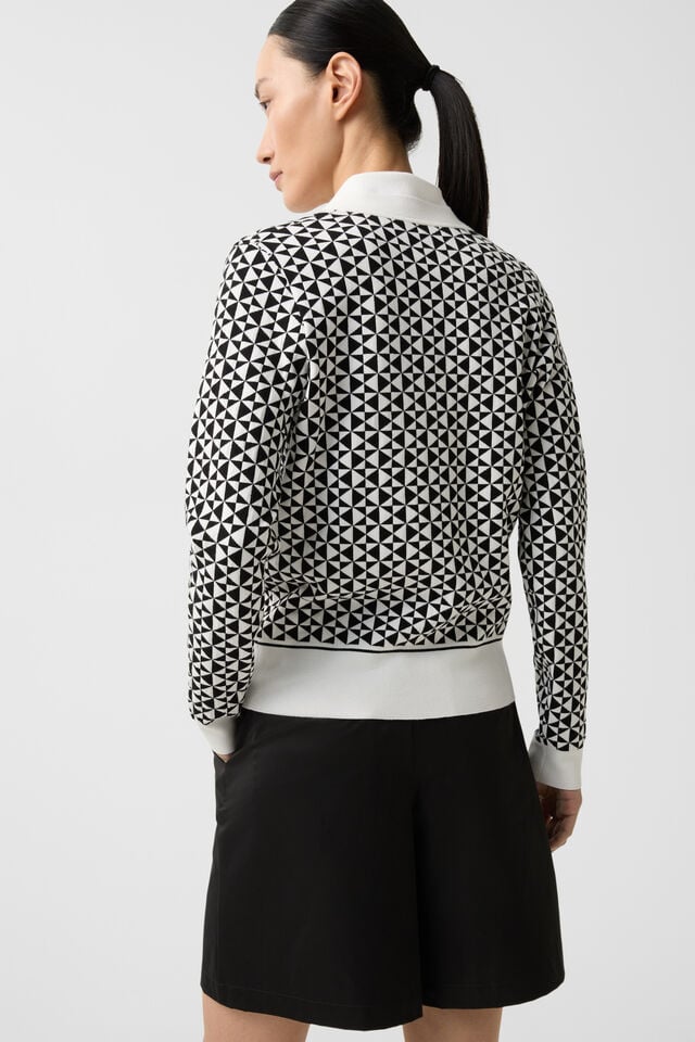 Women’s cardigan in a classic silhouette is made in a geometric jacquard design, giving it an elegant and modern look