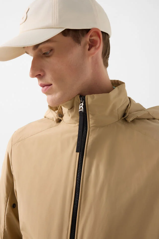 Яке в прав силует и подплатена яка, сваляща се качулка с връзки за стягане, дълги ръкави с частично еластични маншети и закопчалки