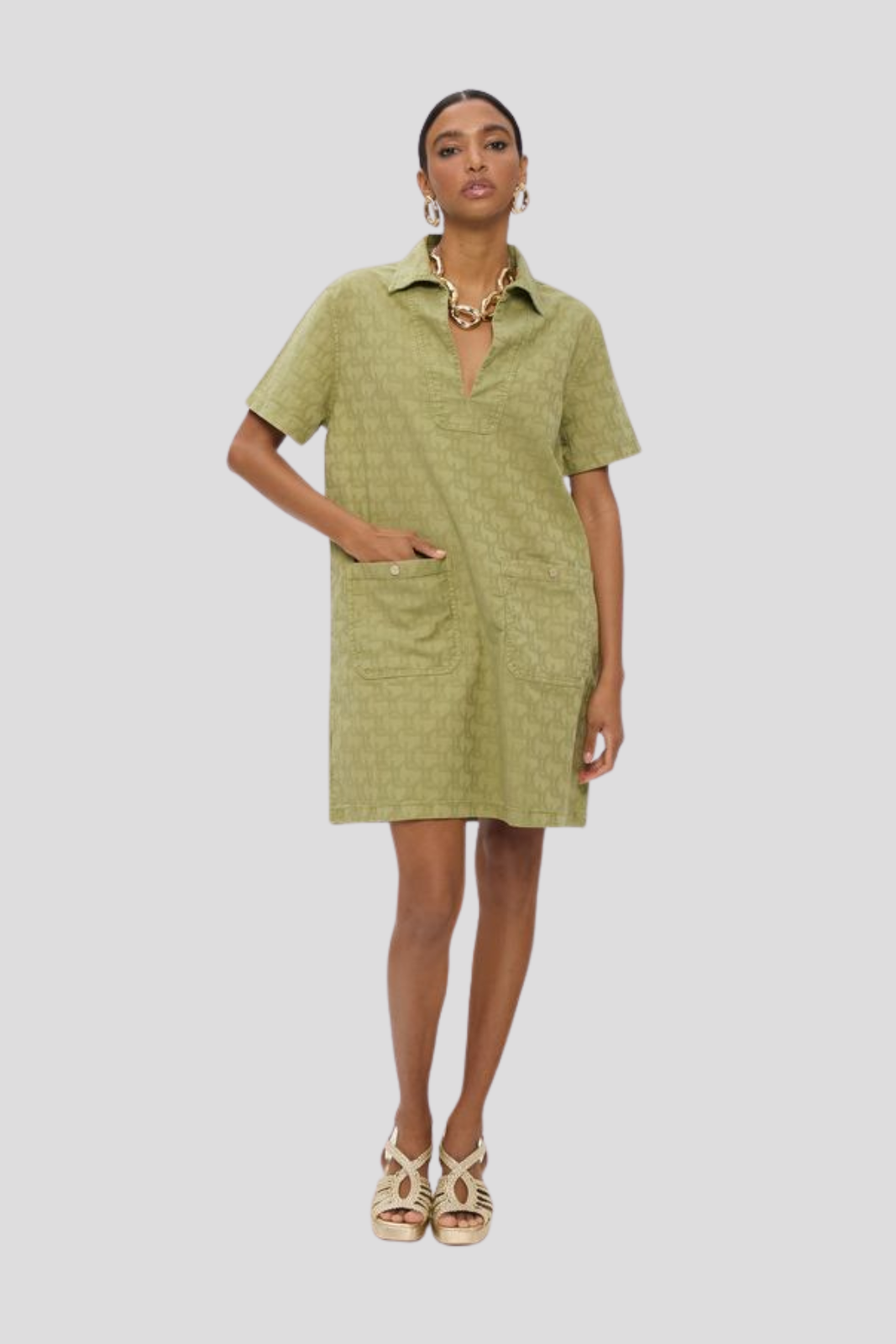Рокля в класически силует с жакардово изтъкано лого и отличителна саржена текстура на материята, която хармонично обединява прецизен детайл, елегантност и съвременно излъчване