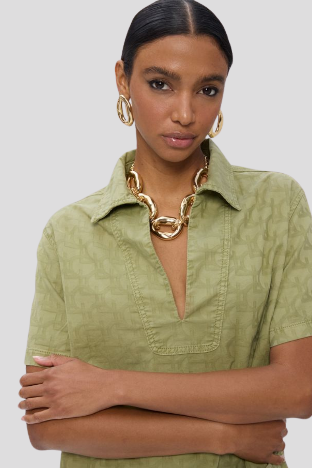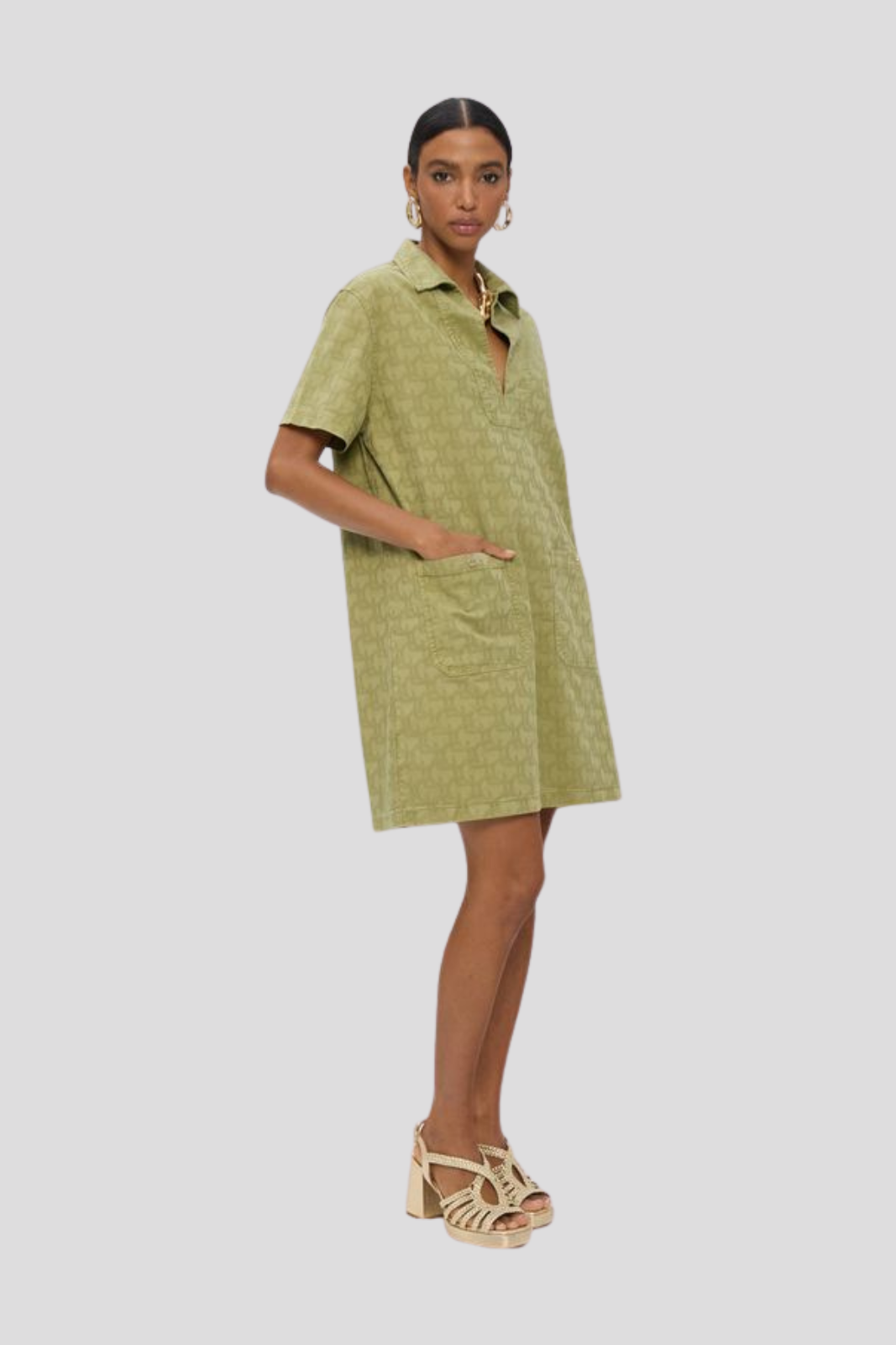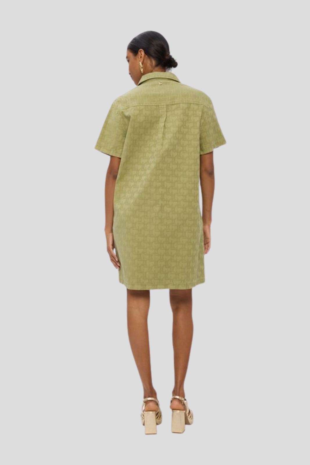 Рокля в класически силует с жакардово изтъкано лого и отличителна саржена текстура на материята, която хармонично обединява прецизен детайл, елегантност и съвременно излъчване