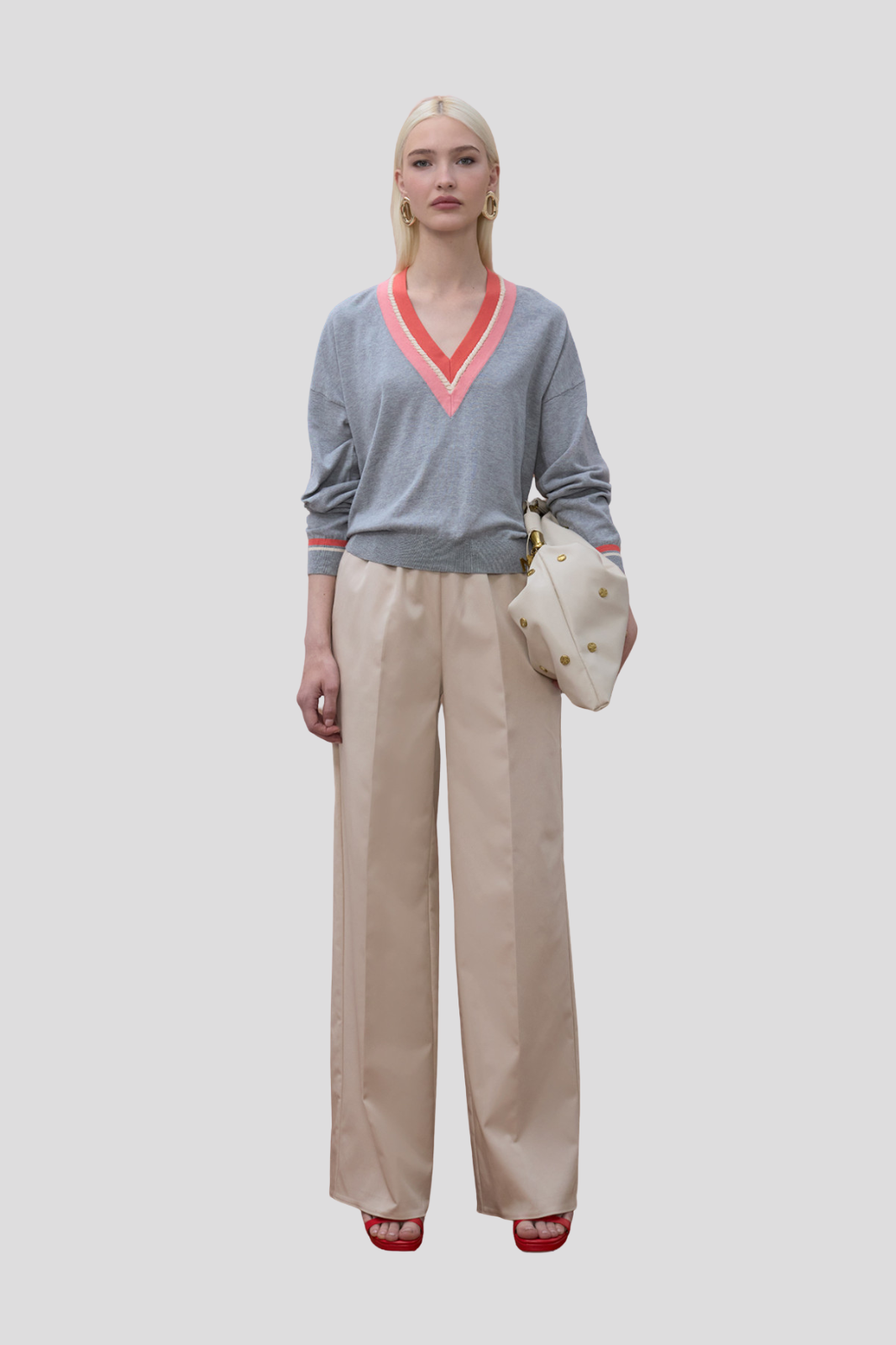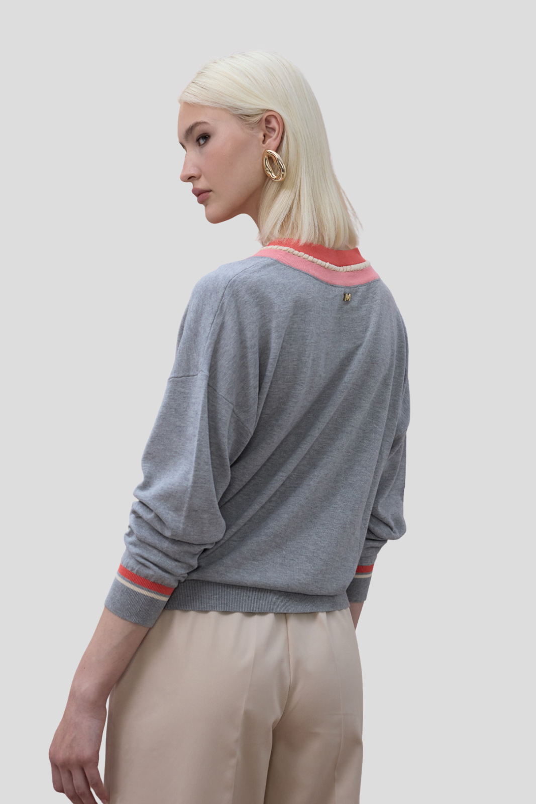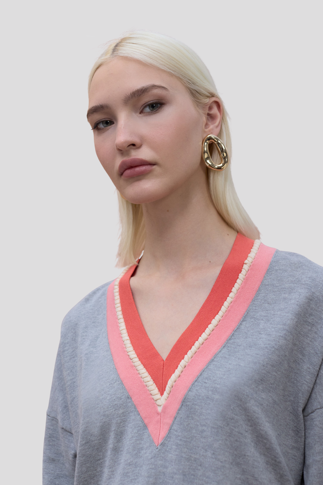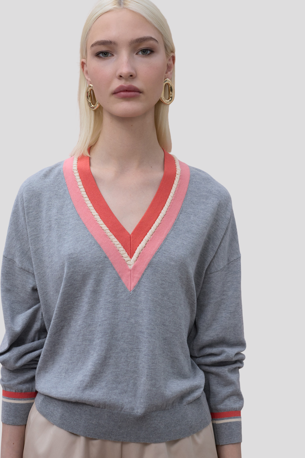 Елегантен пуловер с контрастно V-образно деколте и декоративен плетен детайл.