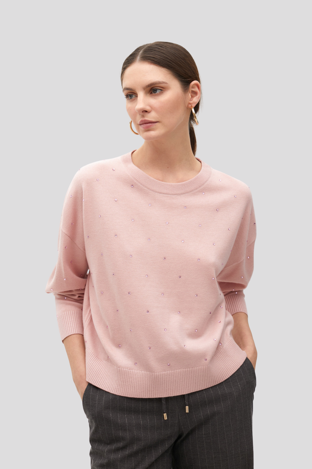Мек плетен пуловер в розово с блестящи детайли от страз