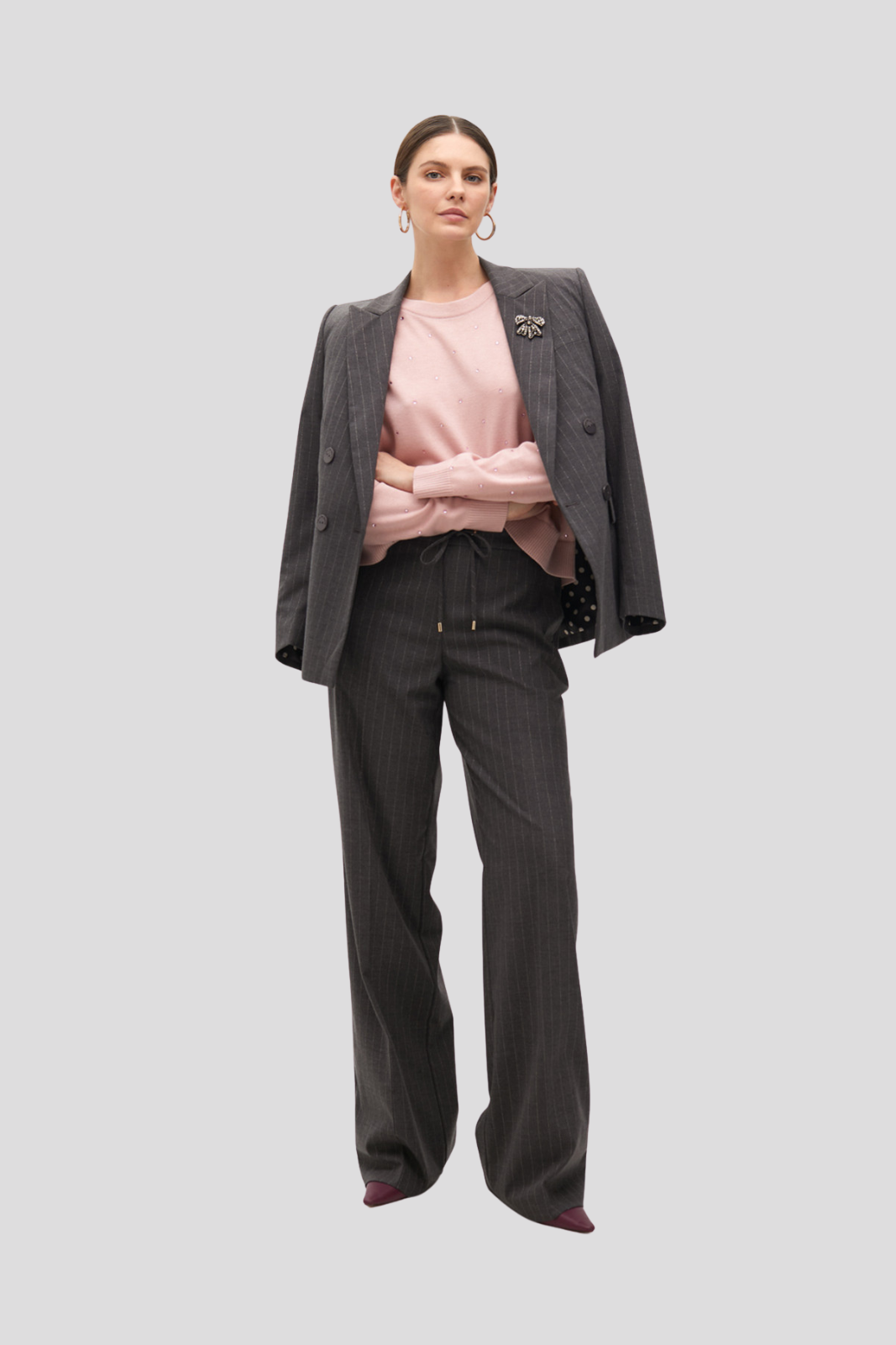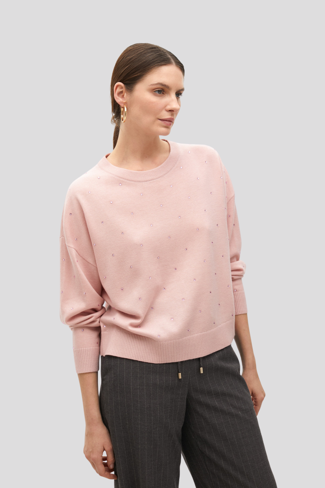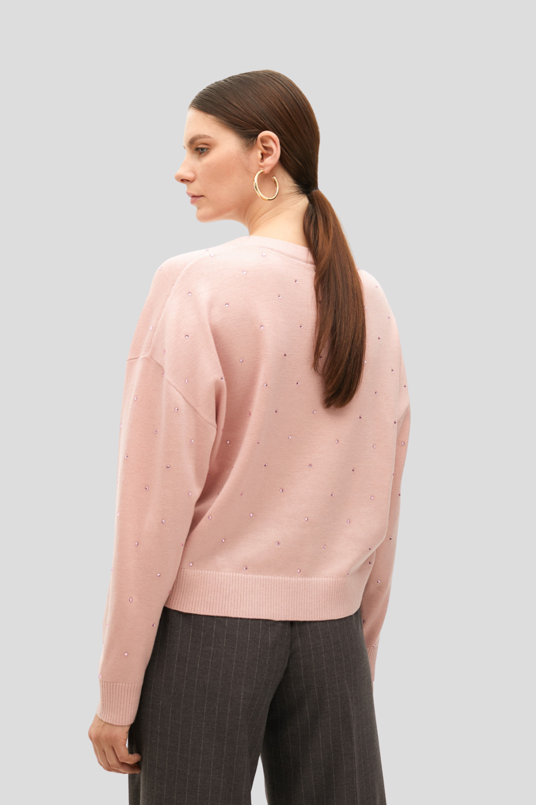 Мек плетен пуловер в розово с блестящи детайли от страз