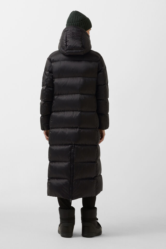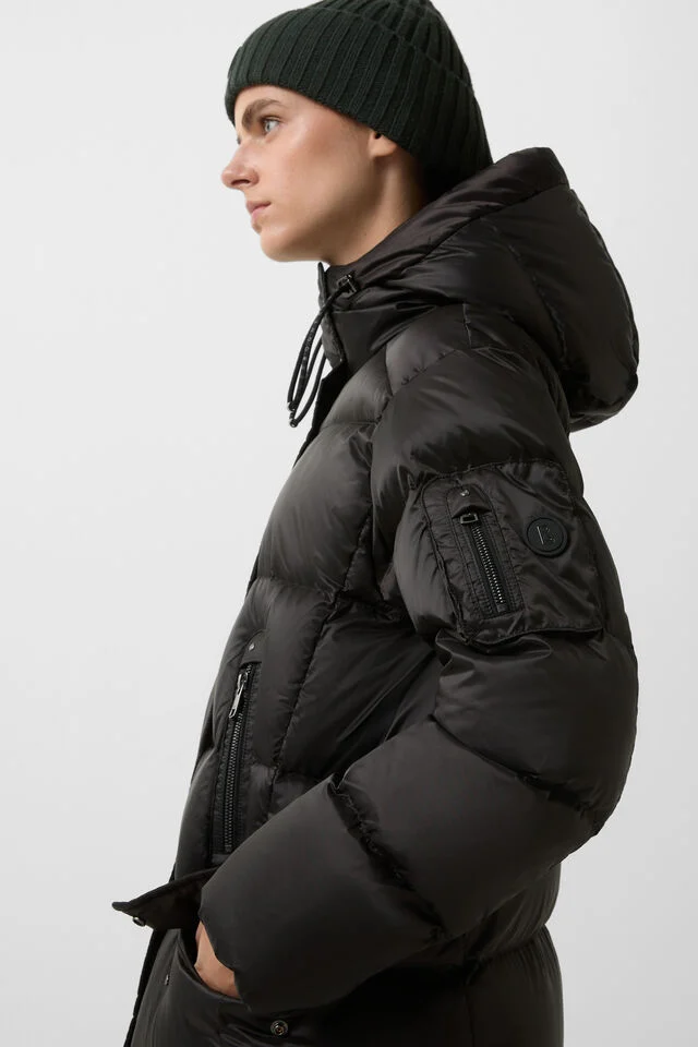 The coat has a water-repellent finish and a warming lining of pure duck down.