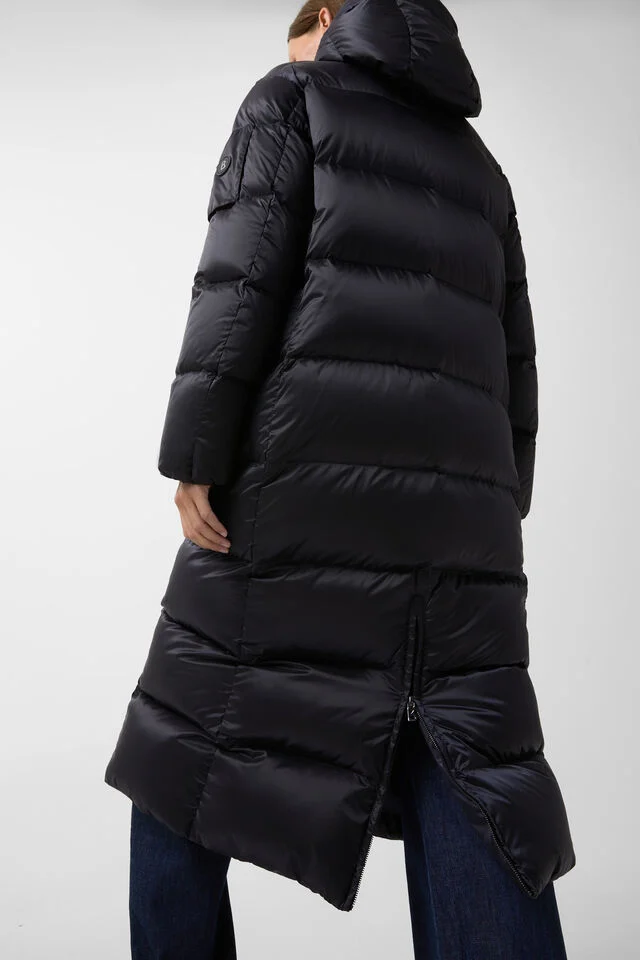 The coat has a water-repellent finish and a warming lining of pure duck down.