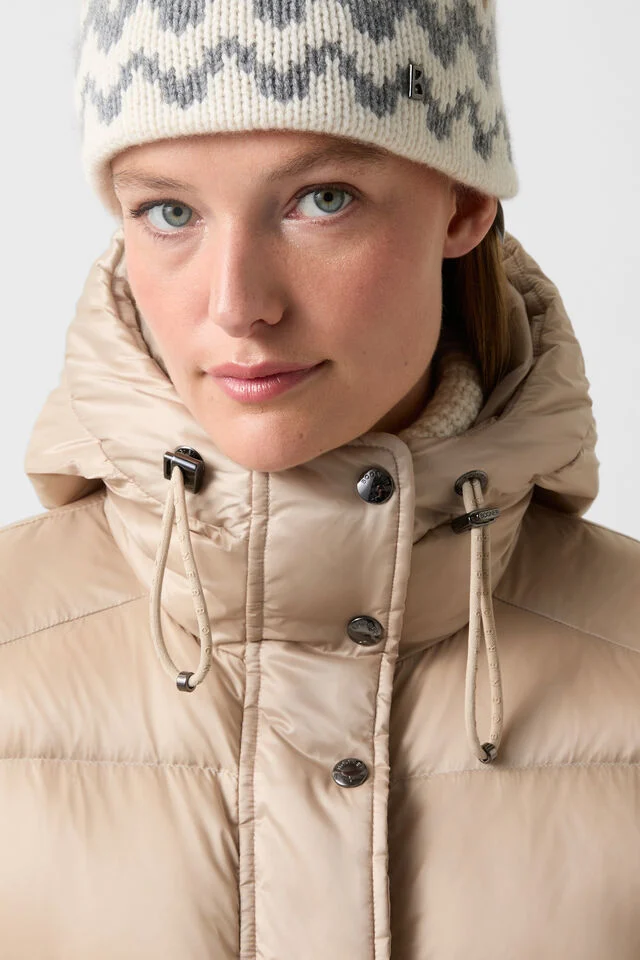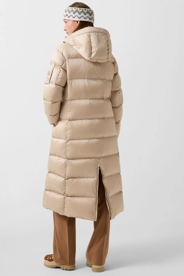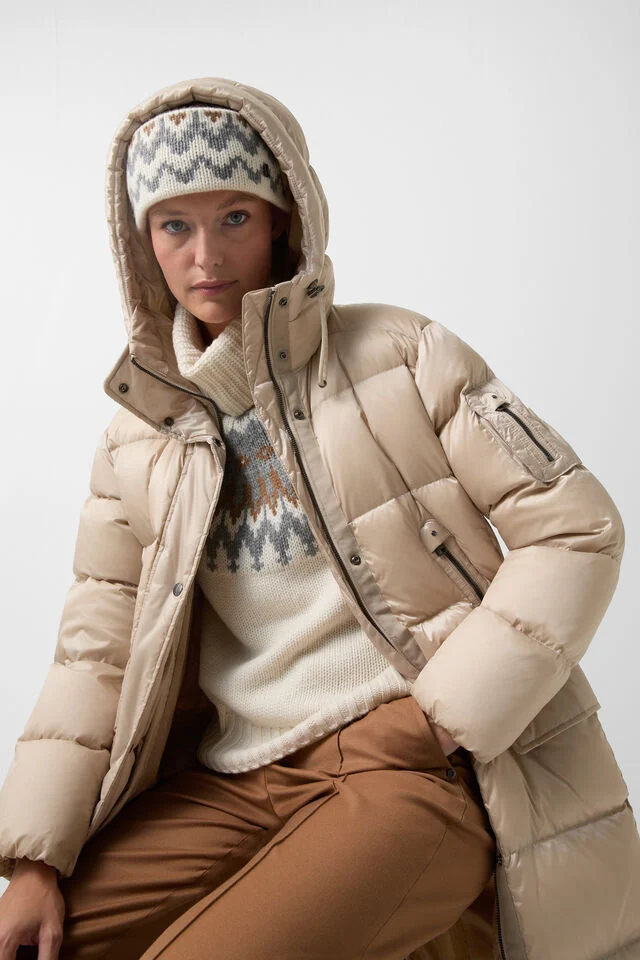 The coat has a water-repellent finish and a warming lining of pure duck down.