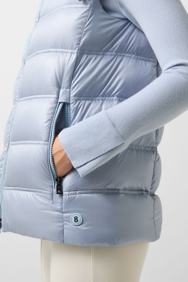 Lightweight quilted vest with padded collar and removable hood with ribbed details, water repellent coating and duck down filling
