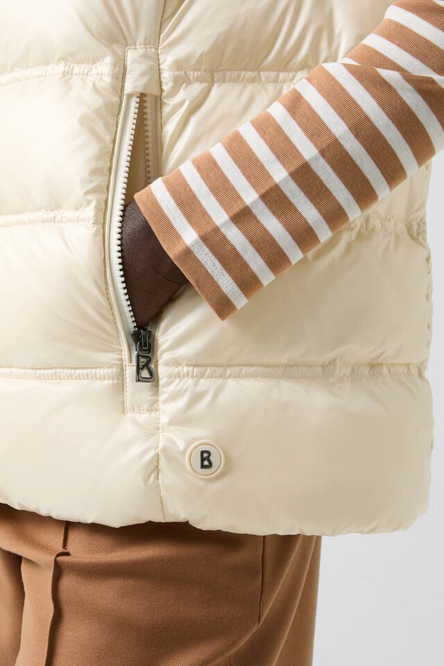 Lightweight quilted vest with padded collar and removable hood with ribbed details, water repellent coating and duck down filling
