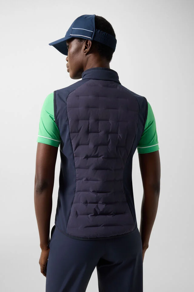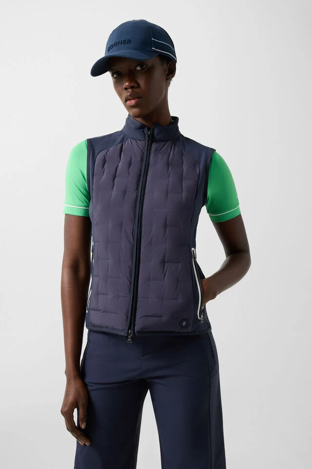 Hybrid gilet with classic silhouette and quilted sections, complemented by a padded stand-up collar, wind vents with narrow cuffs and an attached two-way zip with B label