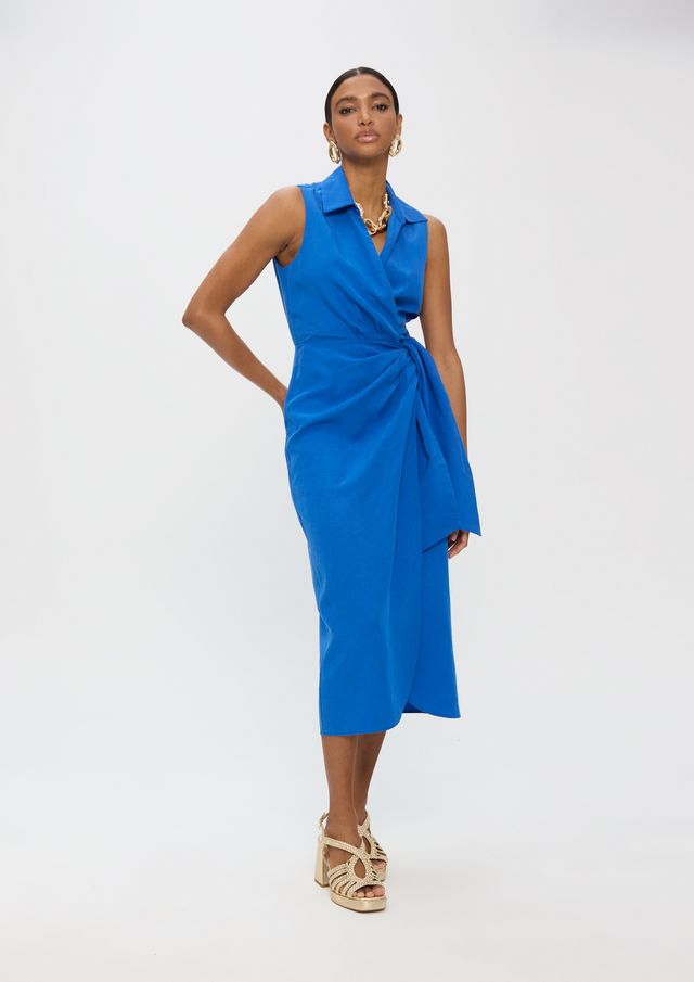 Рокля от лен с яка тип риза в изискан класически силует, подчертана с елегантен страничен възел — хармонично съчетание на лекота, структурираност и фин декоративен акцент