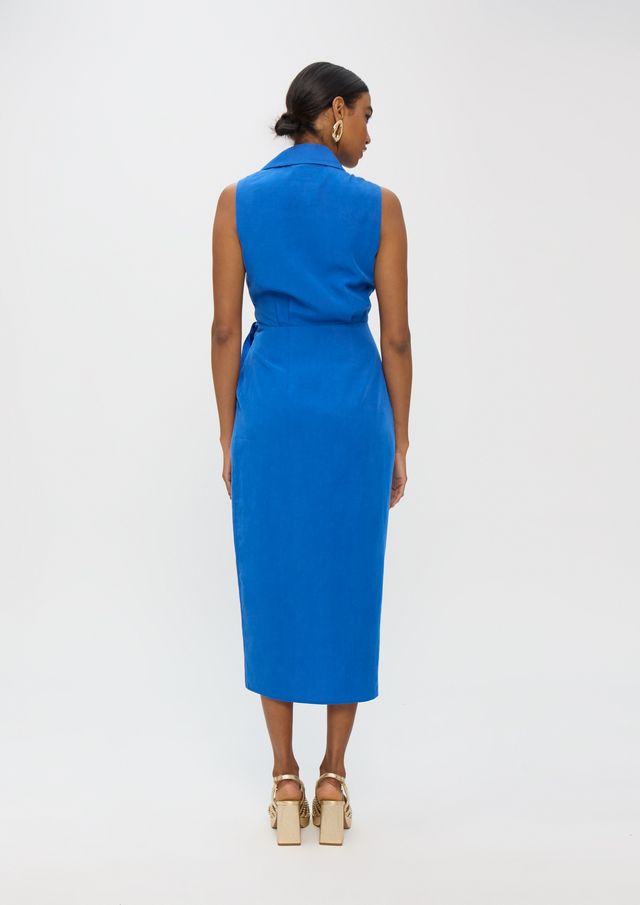 Рокля от лен с яка тип риза в изискан класически силует, подчертана с елегантен страничен възел — хармонично съчетание на лекота, структурираност и фин декоративен акцент