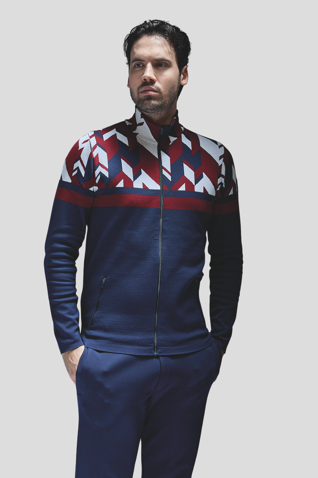 The technological innovation of the fabric is highlighted by the graphic design of the exclusively crafted jacquard