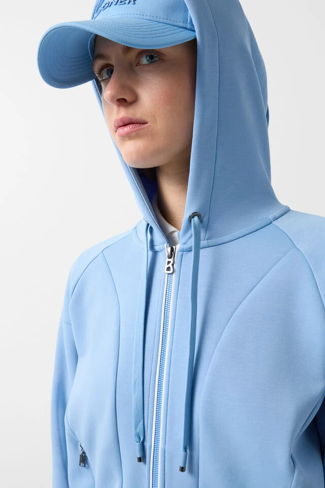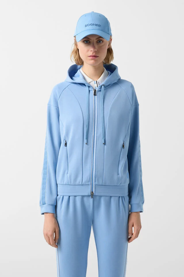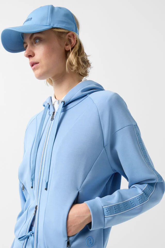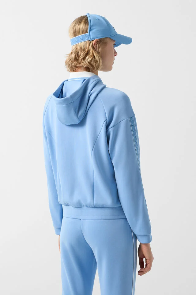 The women’s hooded sweatshirt is a straight silhouette exuding class and sophistication, with a fixed hood embellished with an embossed B logo strip over subtle trim.