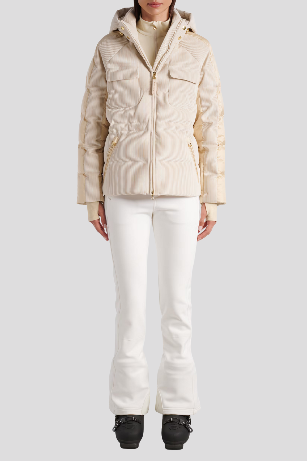 Carefully positioned pockets combine functionality and elegance – a zippered ski map pocket on the sleeve, two seamed pockets with flaps and concealed teak-tack closures on the chest, two zippered side pockets, and an interior pocket for maximum comfort