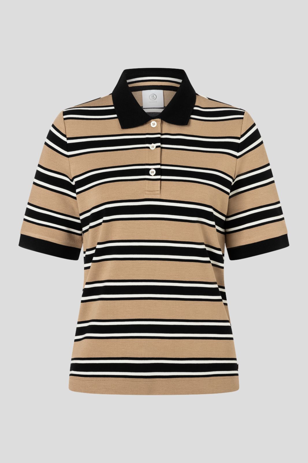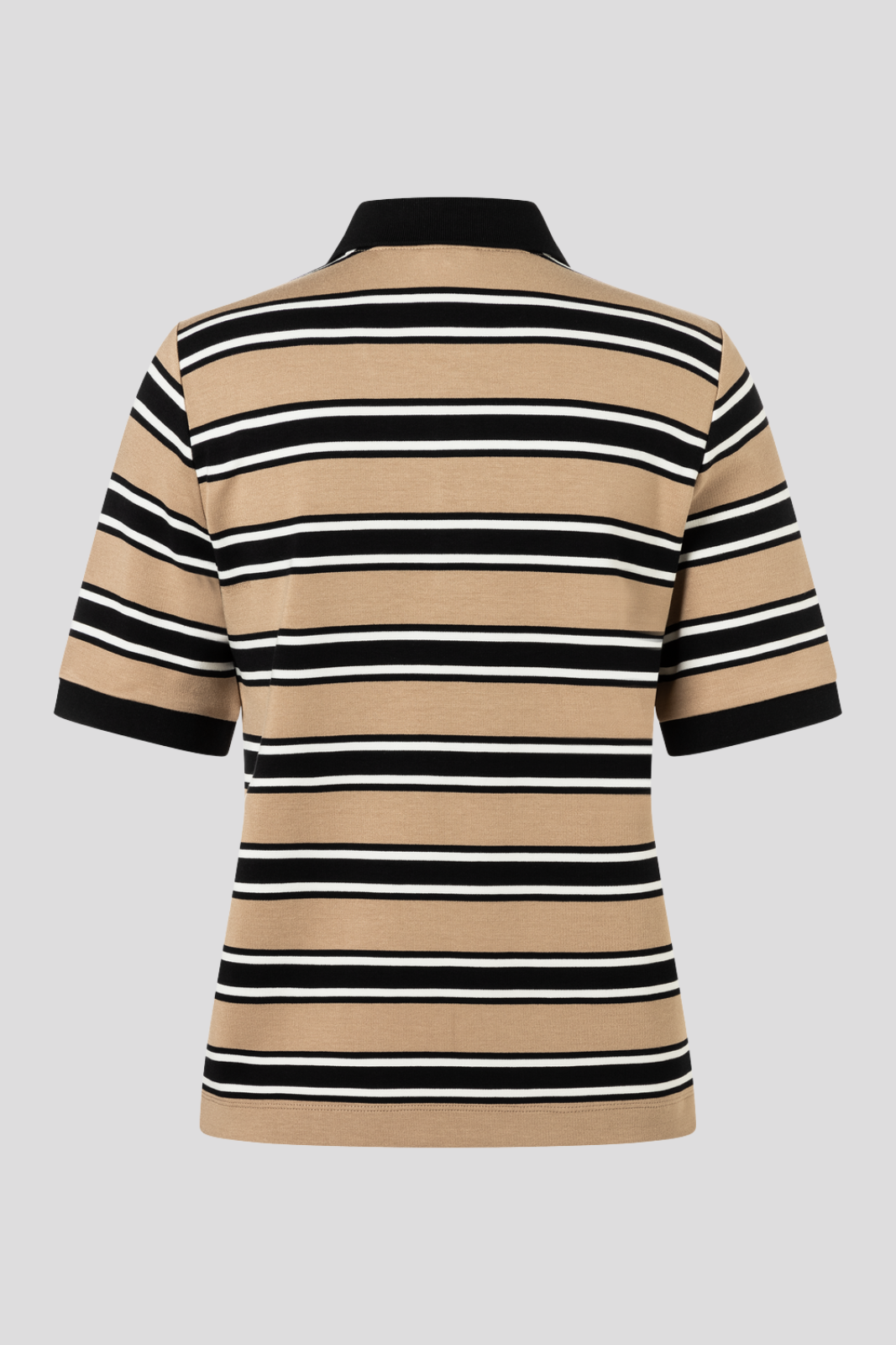 Ribbed polo collar, short sleeves, ribbed cuffs, short hidden B-notch, rubber logo patch on hem