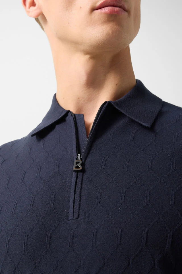 Ribbed polo collar, short sleeves, ribbed cuffs, short hidden B-notch, rubber logo patch on hem