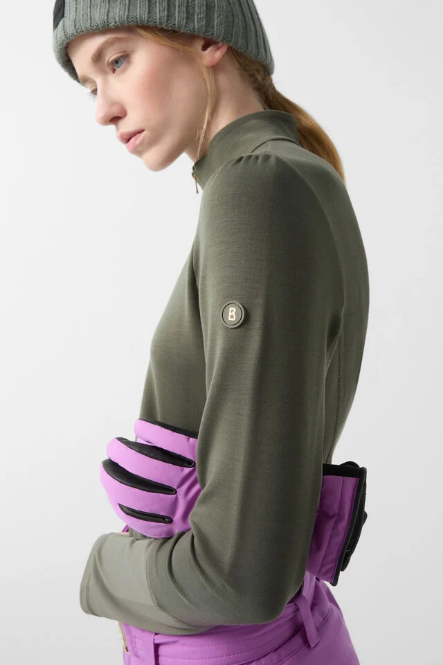First layer in a straight silhouette and stand-up collar, finished with long sleeves and double stitched cuffs
