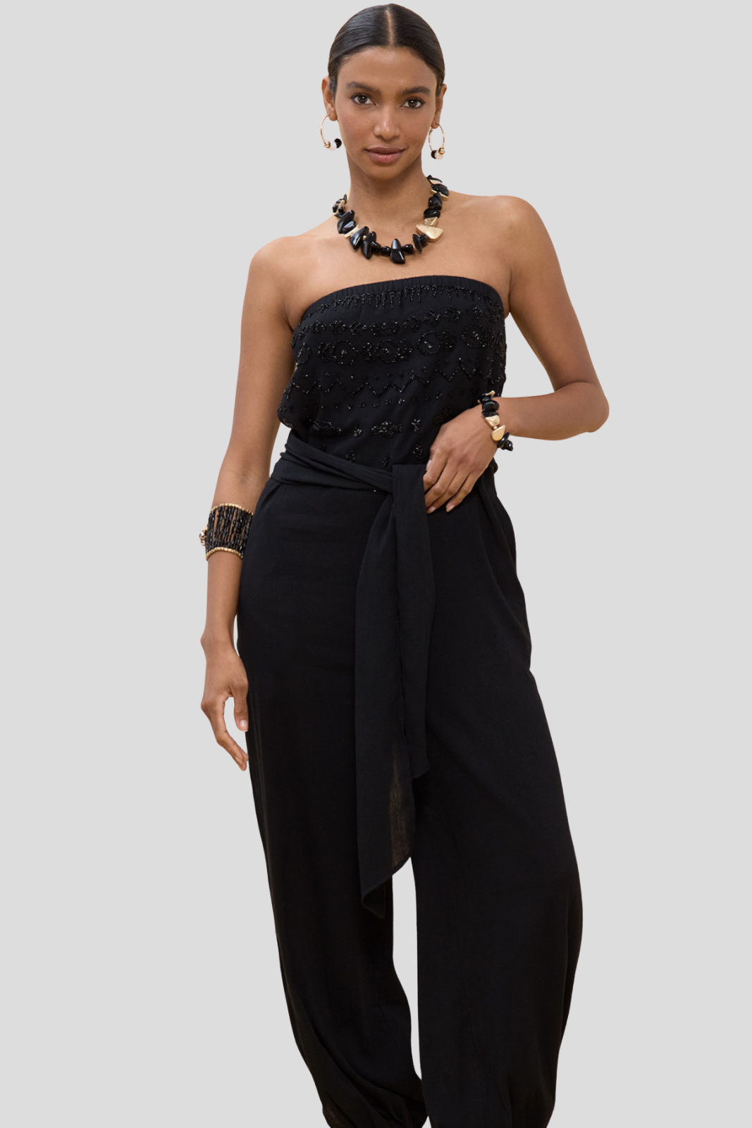 Elegant strapless jumpsuit with embroidery and sequin details