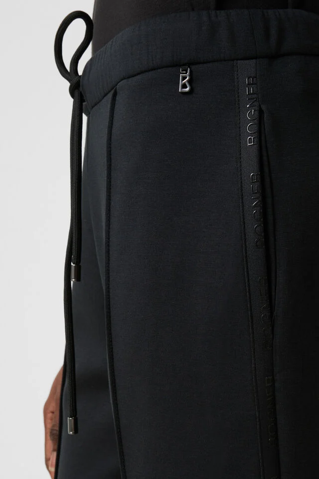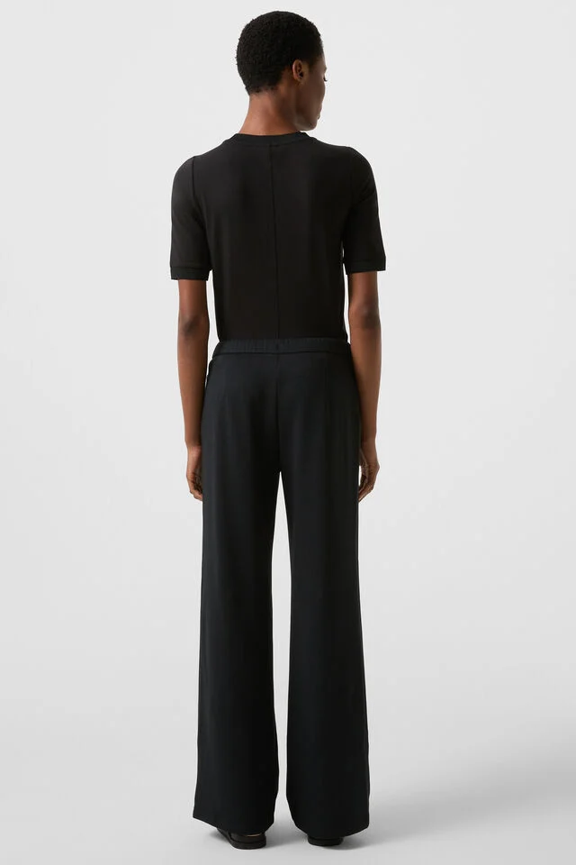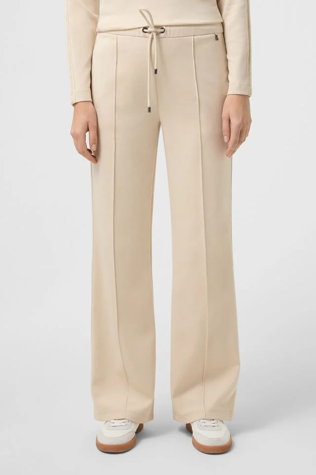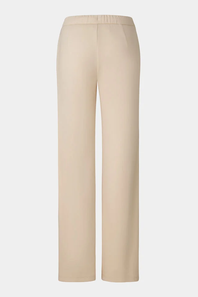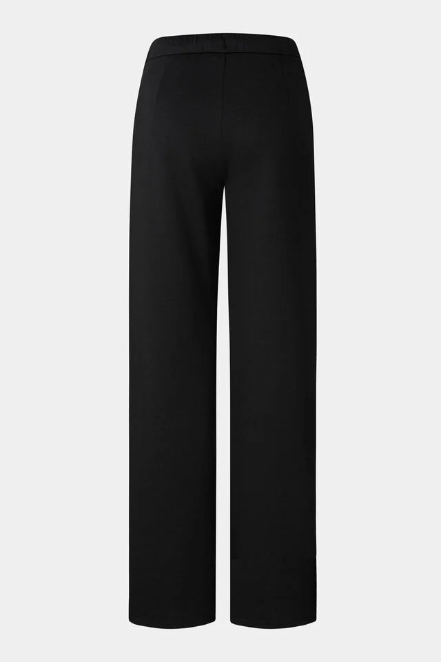 Elegant jersey trousers in straight silhouette and extra leg length with front hem, double stitched hems, hidden side pockets