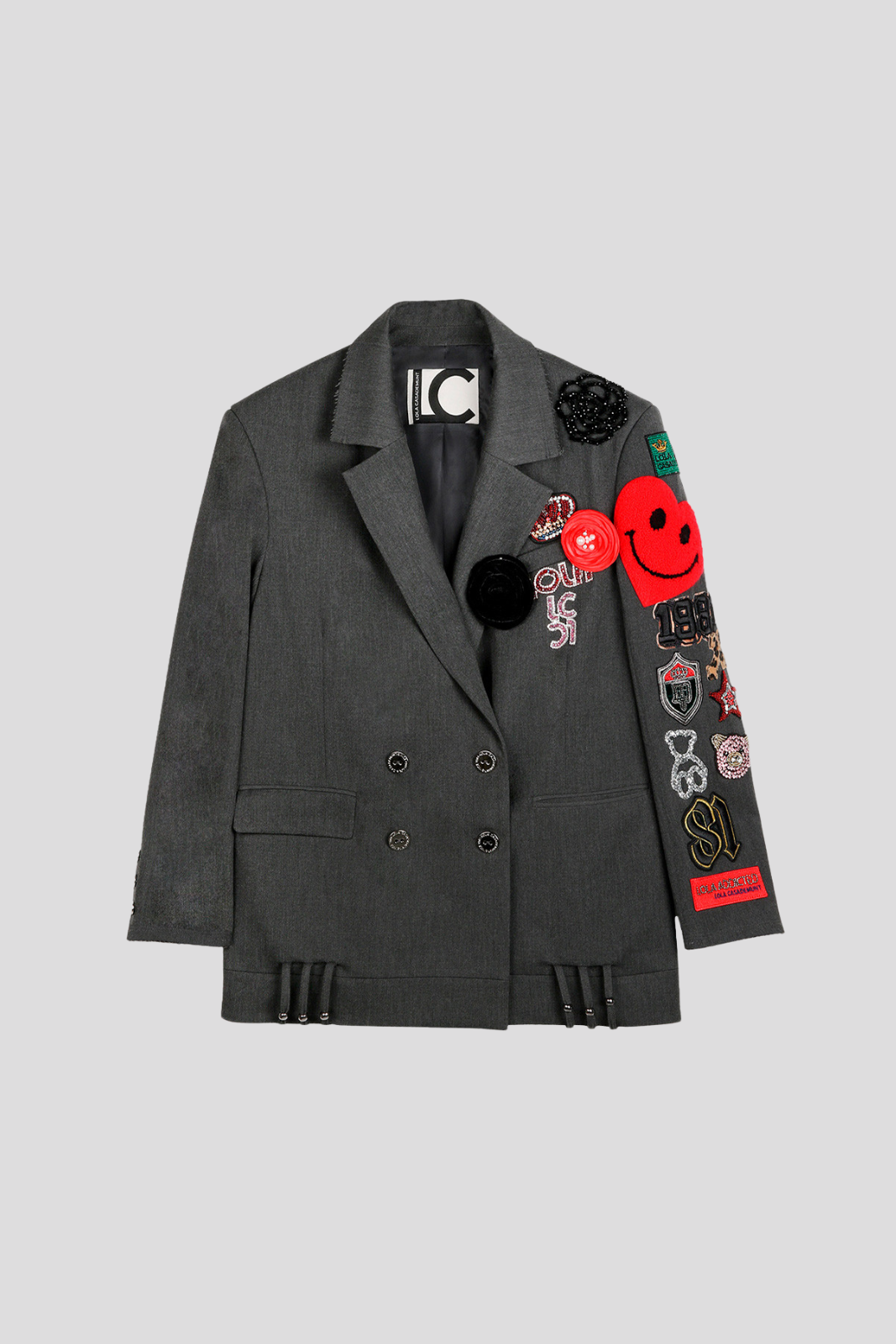 Оувърсайз двуредно сако в класически силует и впечатляващи апликации на ръкава