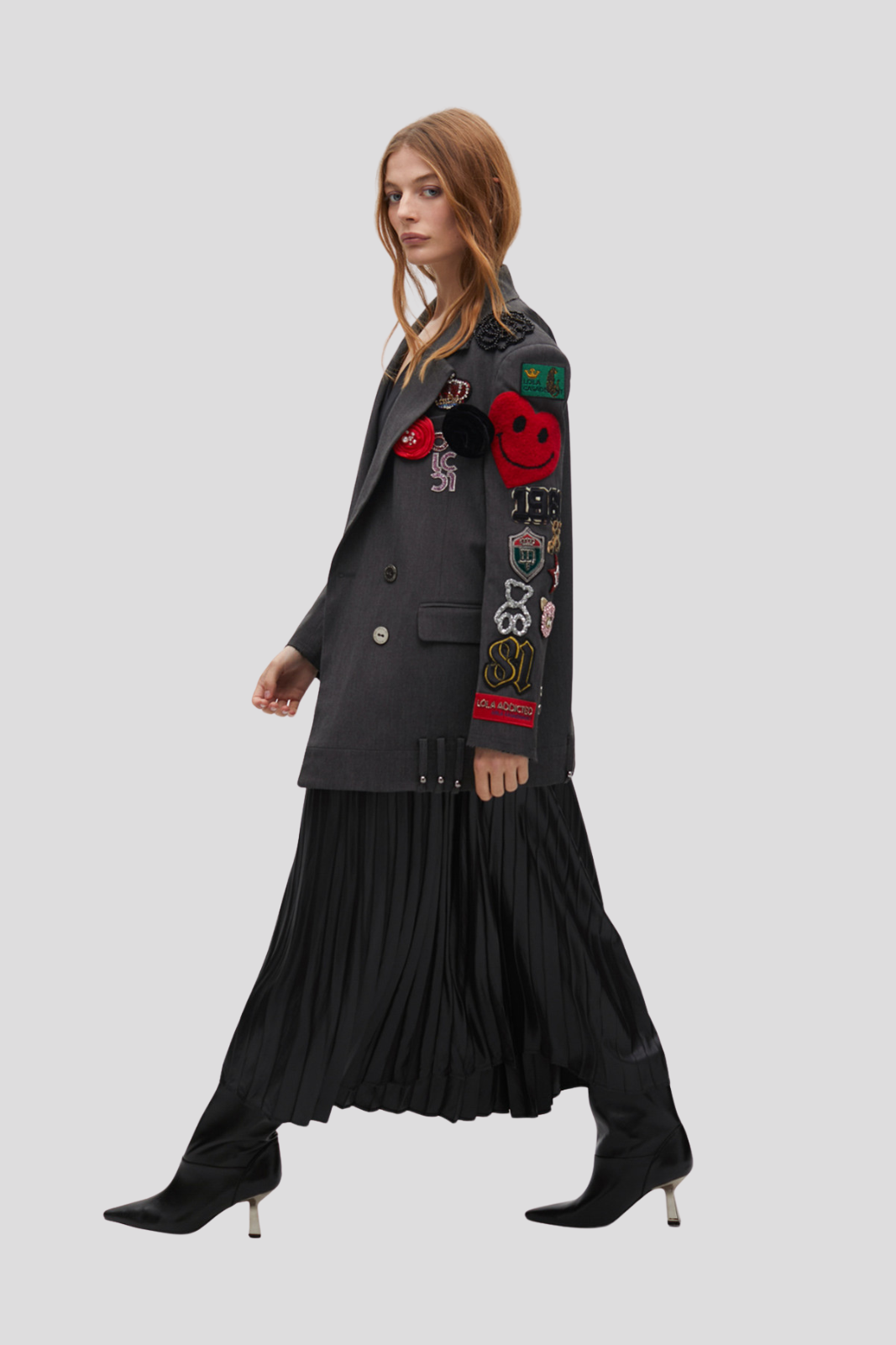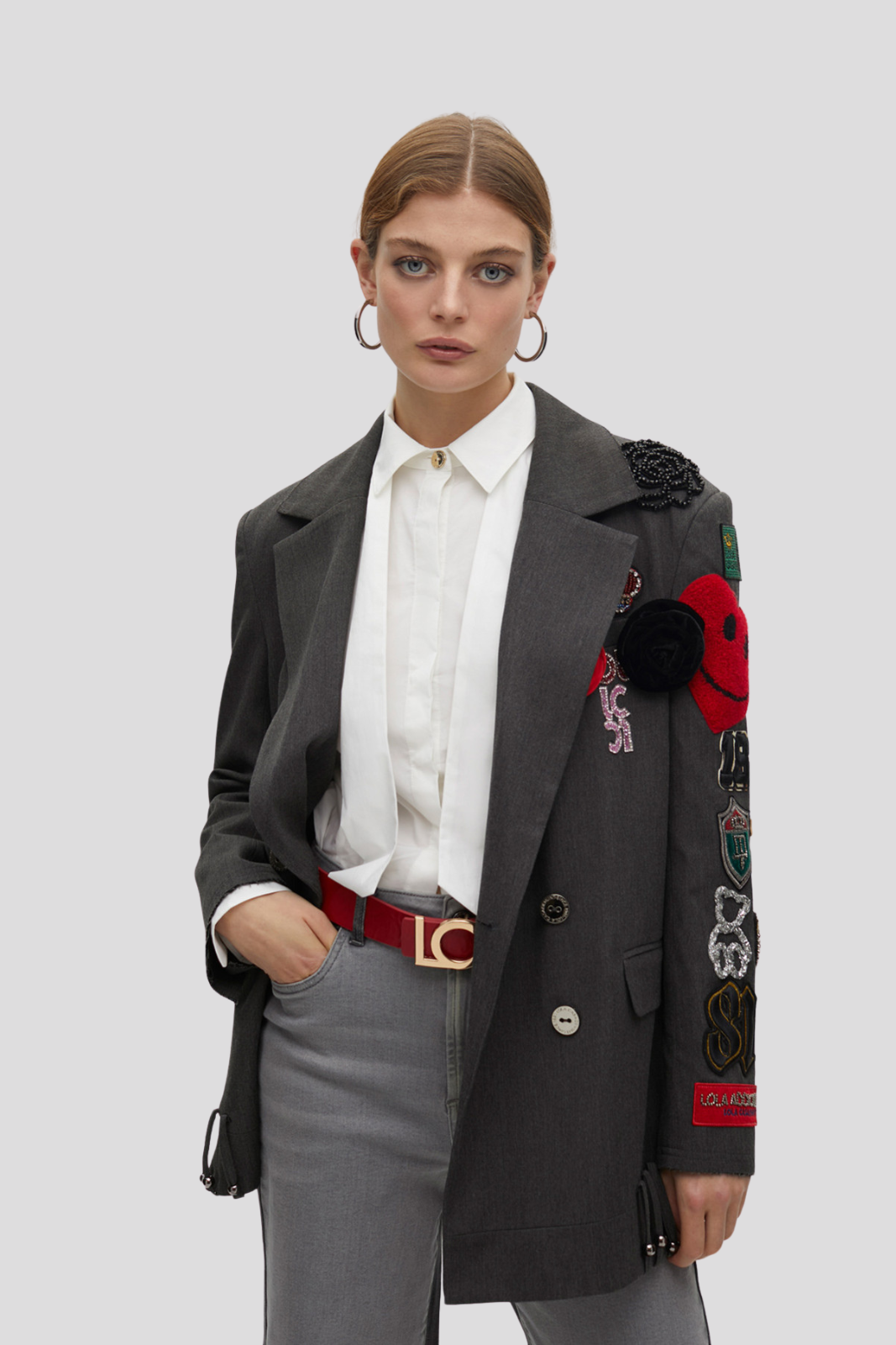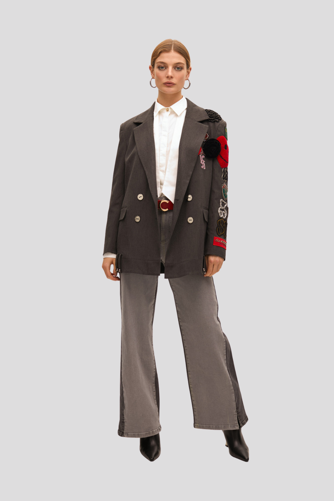 Оувърсайз двуредно сако в класически силует и впечатляващи апликации на ръкава