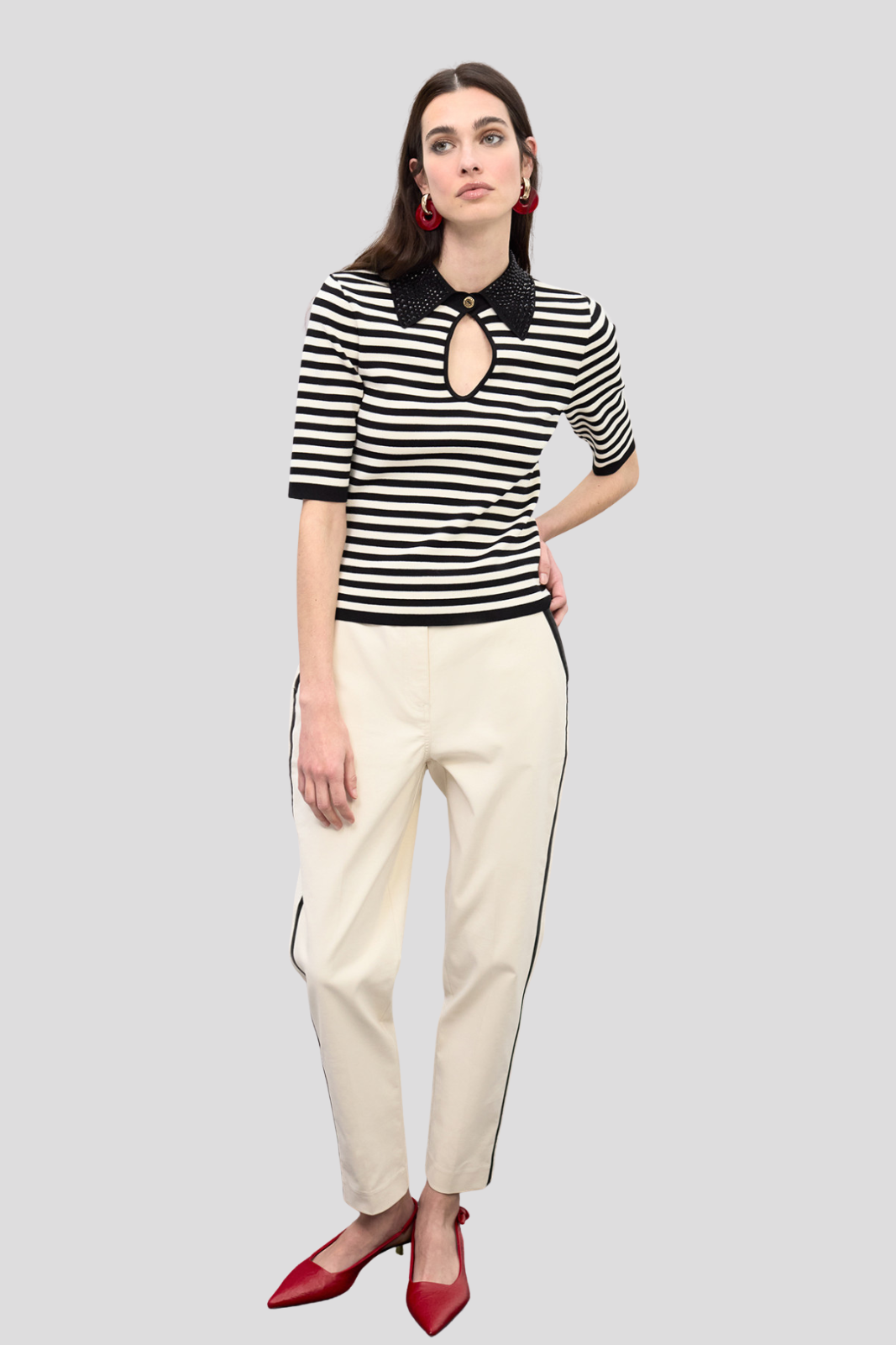 Панталон в класически силует, допълнен с контрастни странични ивици от P.U., които придават модерен акцент