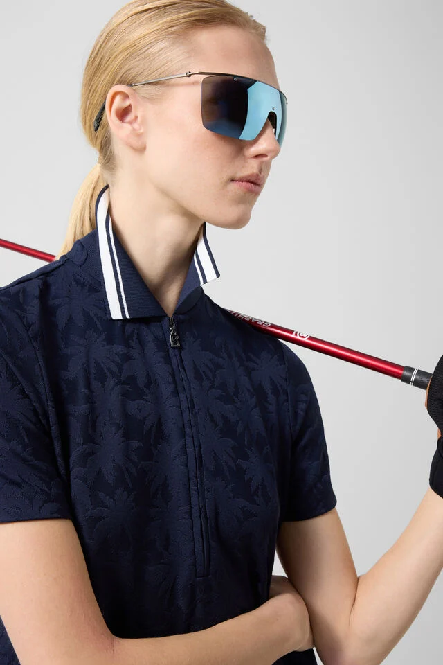 Polo collar with striped accents and short sleeves with double stitched cuffs