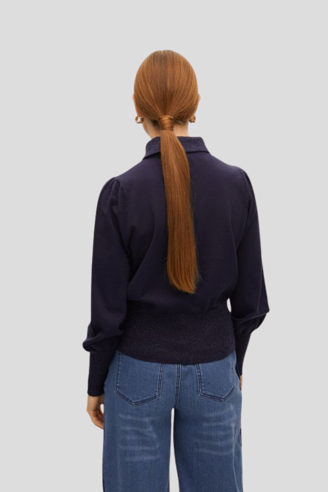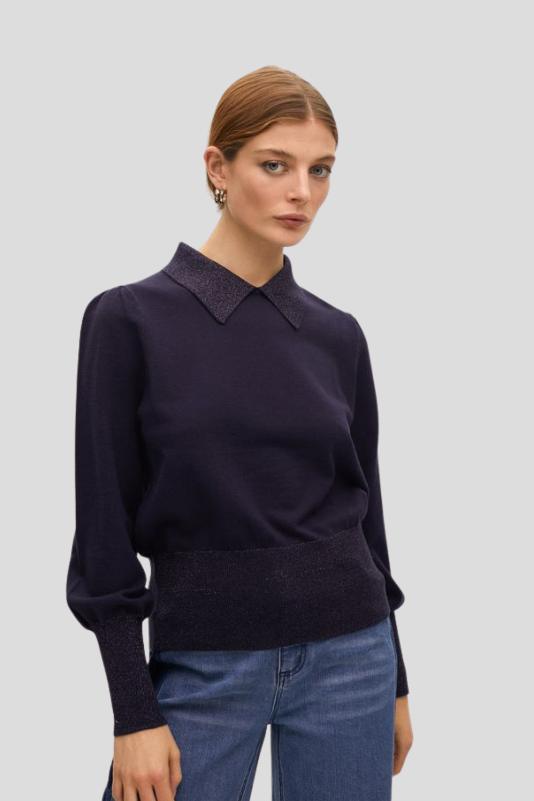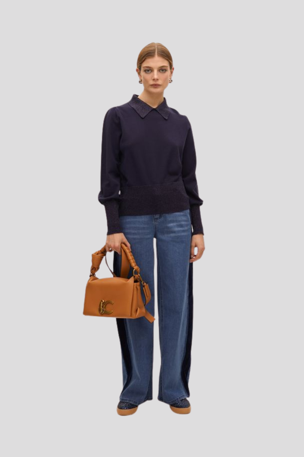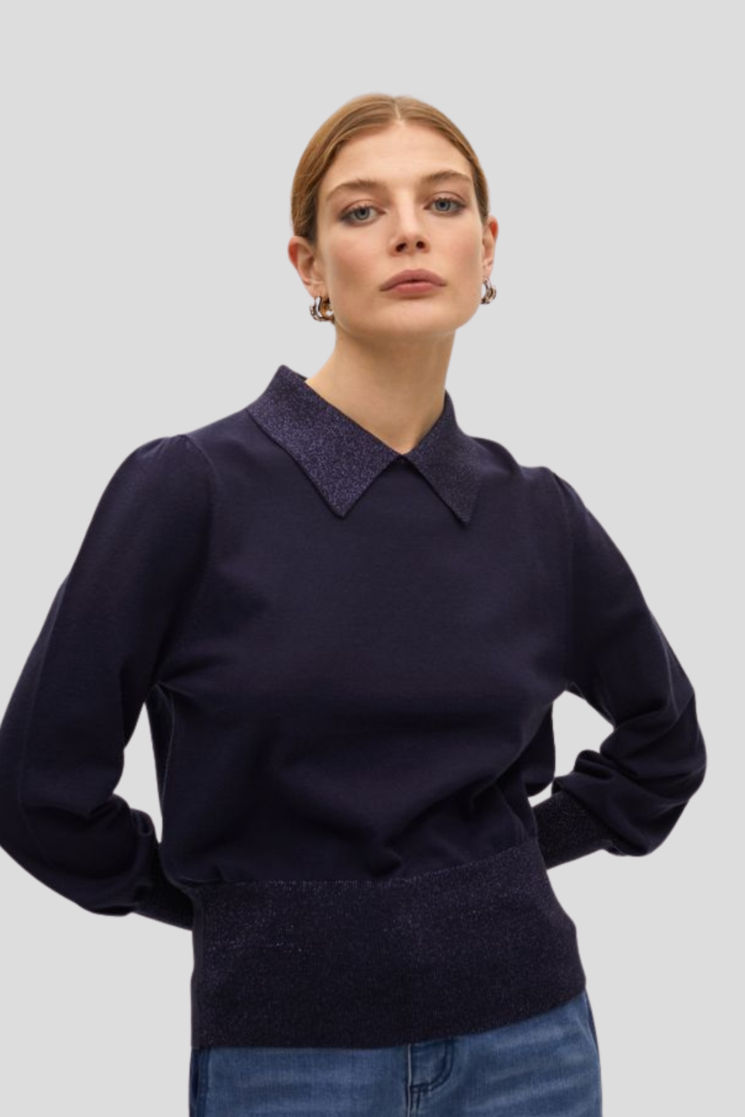 Елегантен пулове в тъмносин цвят с дълги ръкави и ефектни лъскави маншети и яка