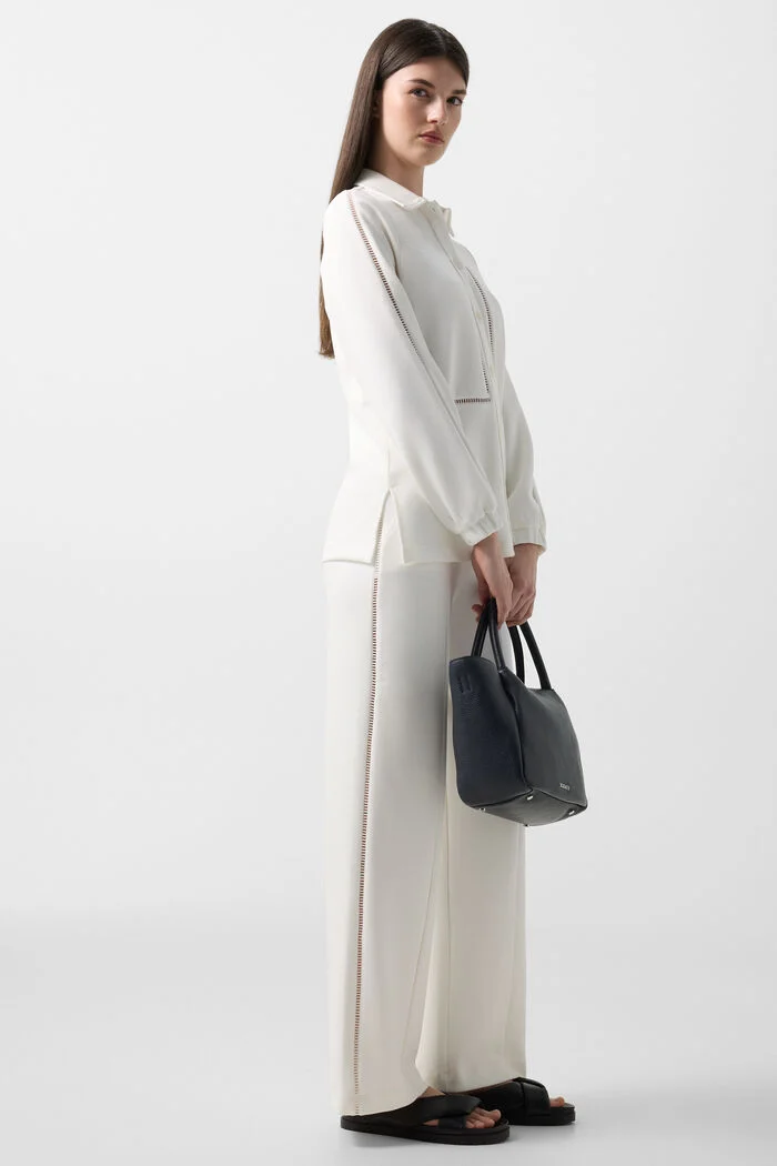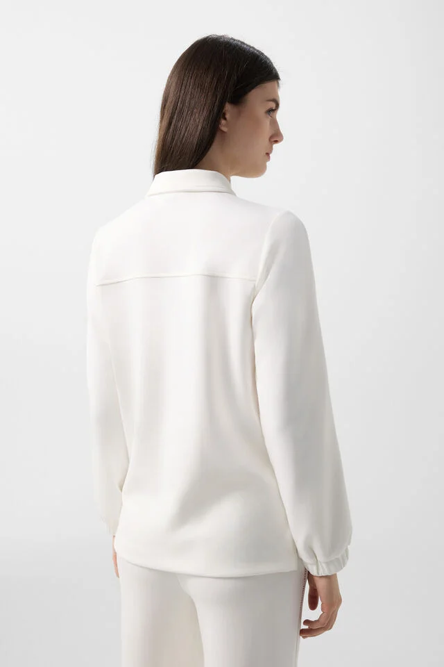 Класическа яка и дълги ръкави с еластични маншети за комфорт и свобода на движение.